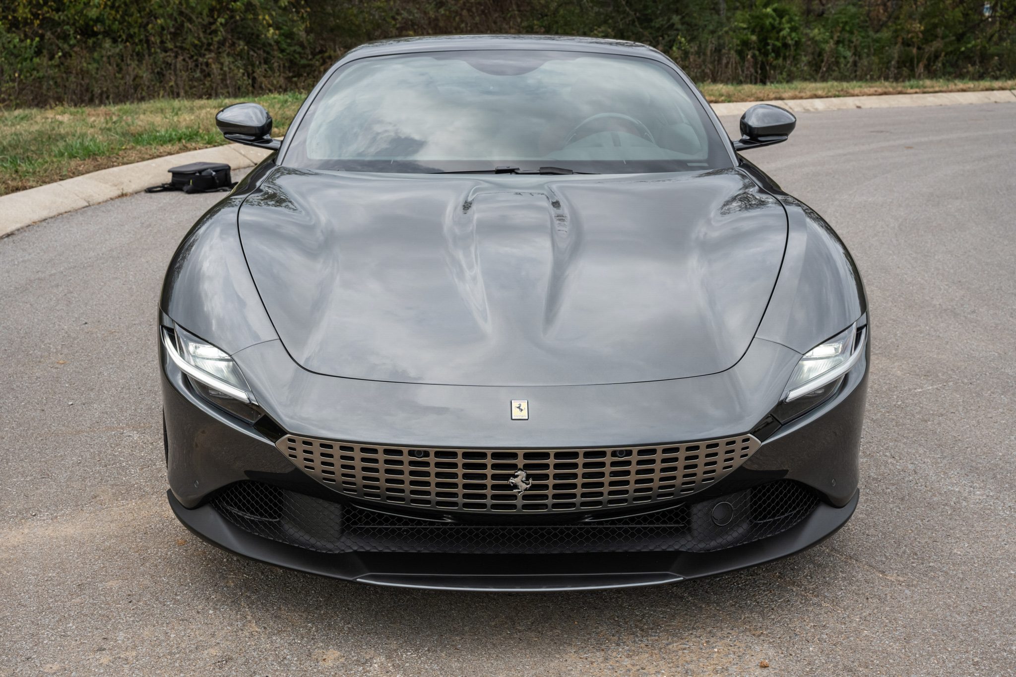 Matte grey-finished 20″ alloy wheels are mounted with 245/35 front and 285/35 rear Michelin Pilot Sport 4S tires. Braking is handled by a Ferrari-branded Brembo system with carbon-ceramic rotors and yellow-painted calipers.
