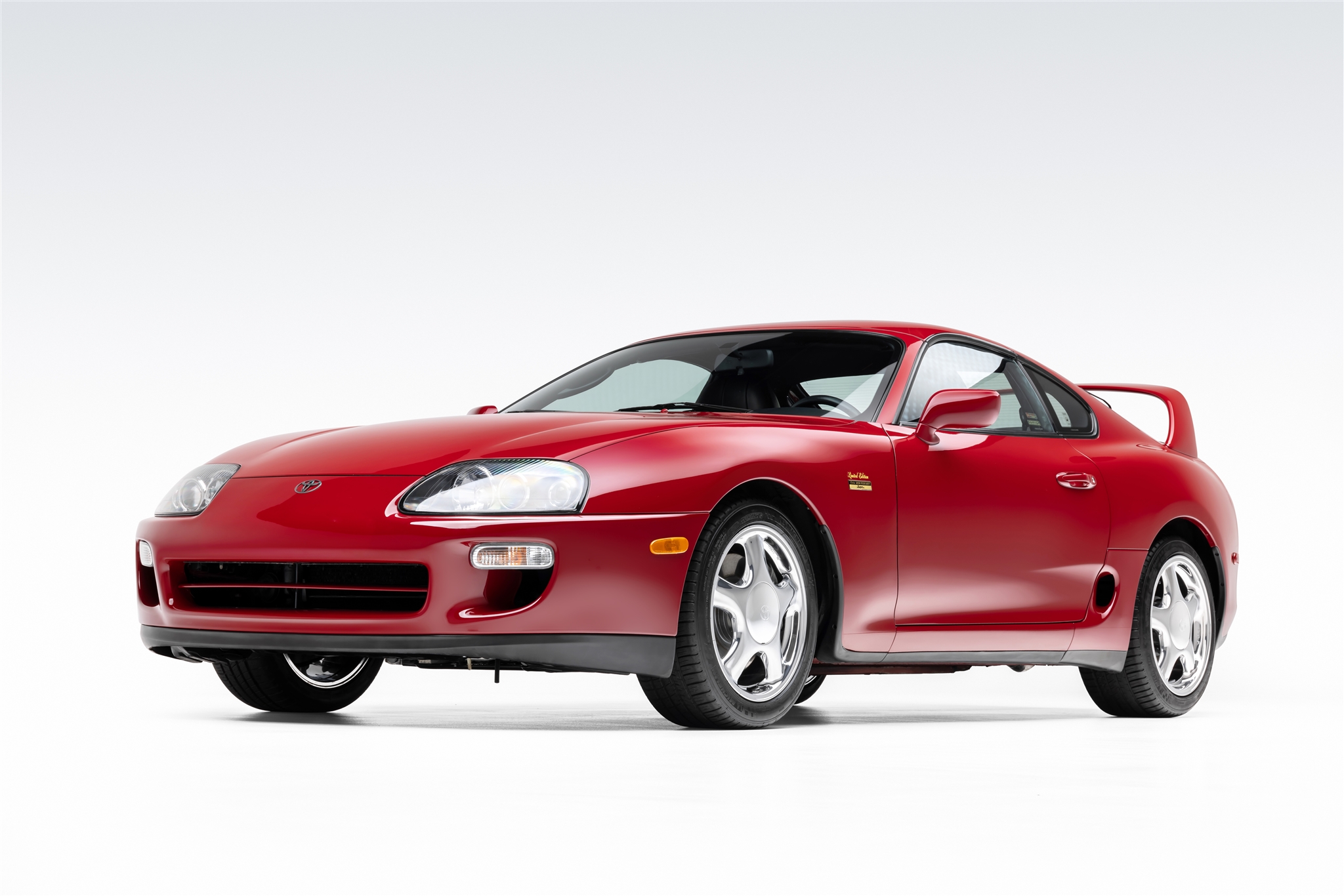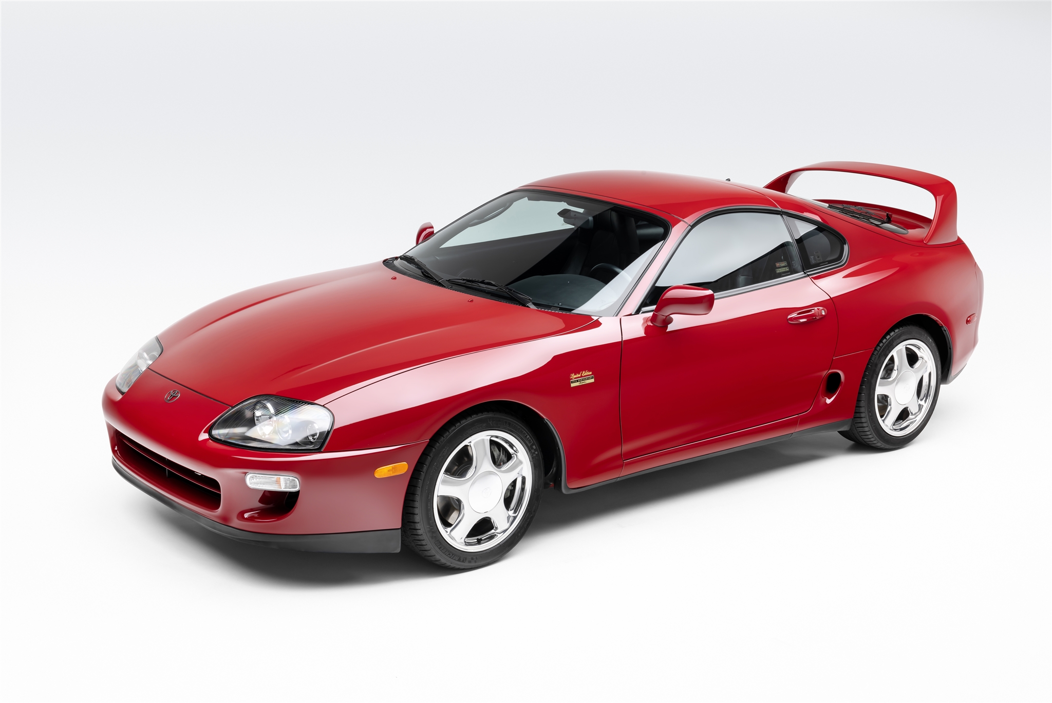 Five-spoke 17″ alloy wheels are mounted with Michelin Pilot Sport A/S 3 tires. The car rides on a four-wheel double-wishbone suspension system and features speed-sensing progressive power rack-and-pinion steering and electronic traction control. Braking is provided by discs with Supra-script calipers. Curb marks are noted on the right-rear wheel.