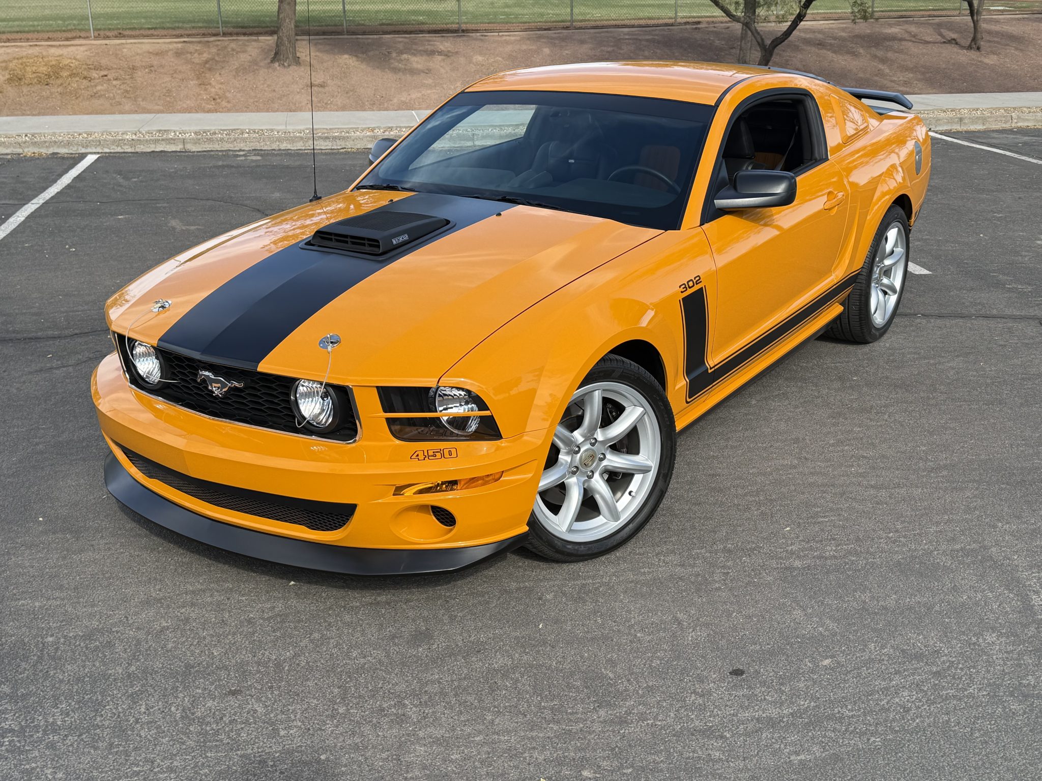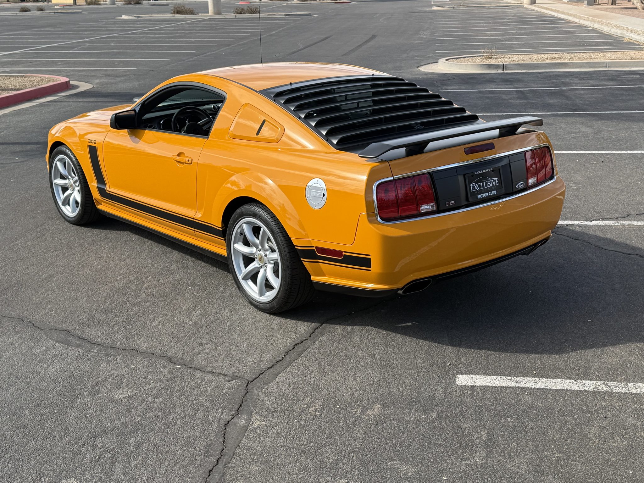 The 19″ seven-spoke wheels feature edition-specific center caps and are mounted with Pirelli tires. The car is equipped with Saleen suspension components, and stopping power is provided by four-wheel disc brakes with four-piston front calipers over slotted rotors.