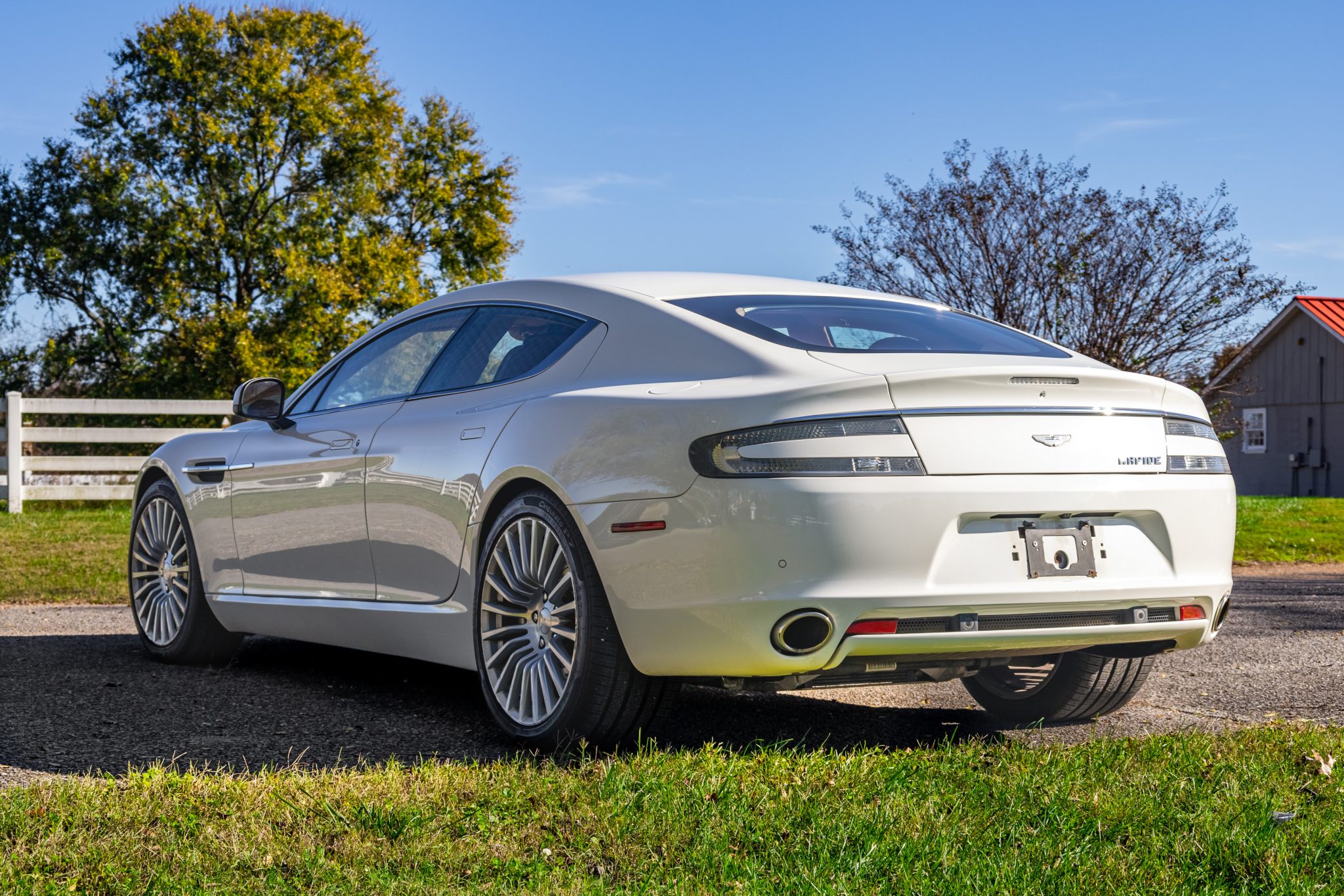 The 20″ multi-spoke alloy wheels show curb marks and are mounted with Pirelli Cinturato P7 tires. Stopping power is provided by Aston Martin-branded calipers over disc brakes at each corner, and the rotors and pads were replaced in October 2024. A three-stage Adaptive Damping System (ADS) with three selectable drive modes was equipped as standard.