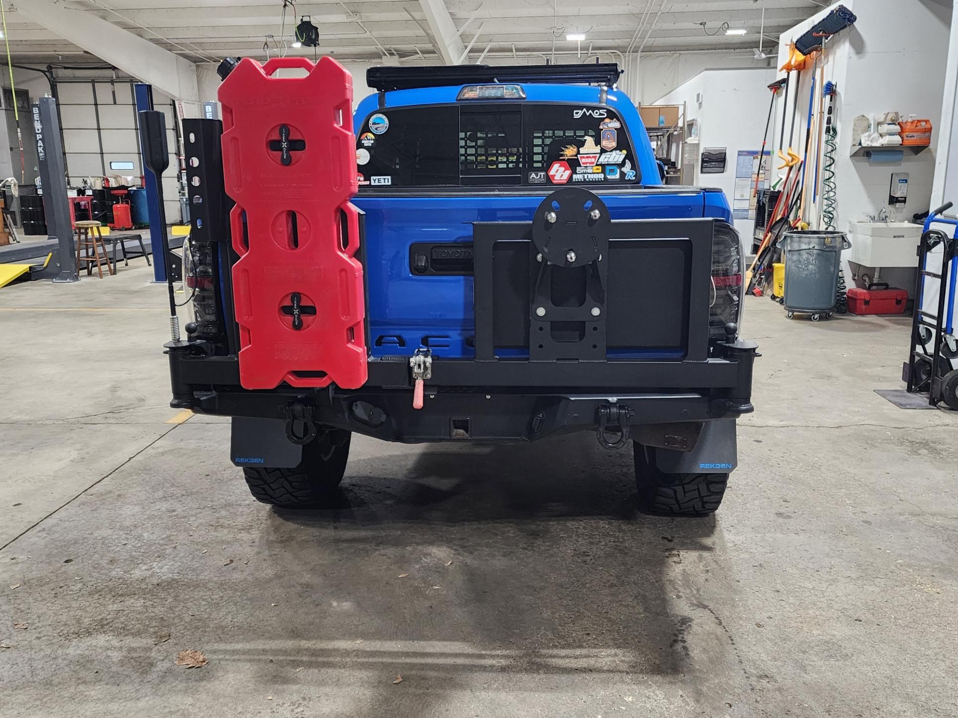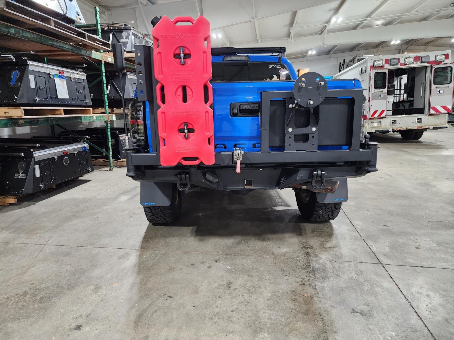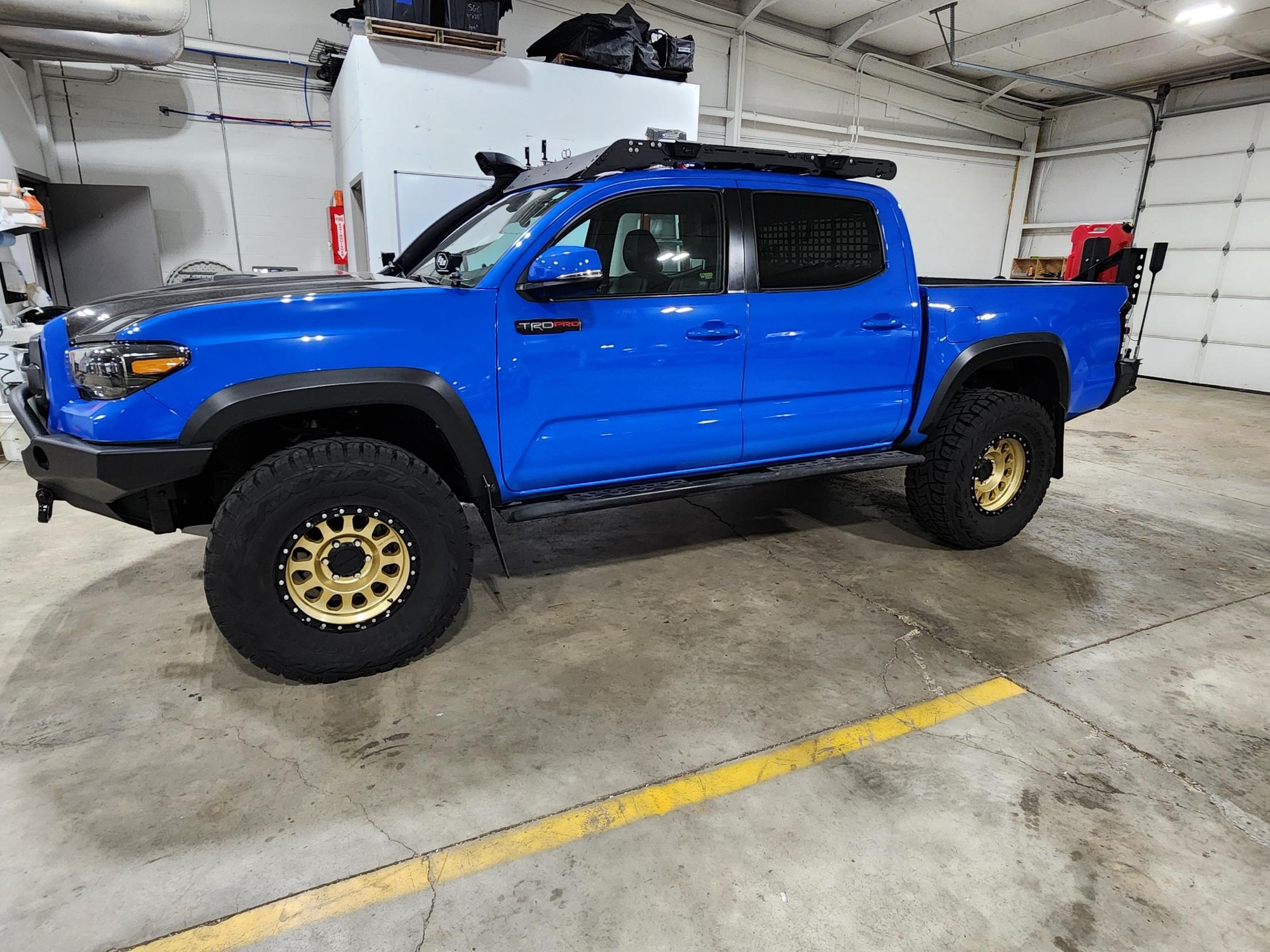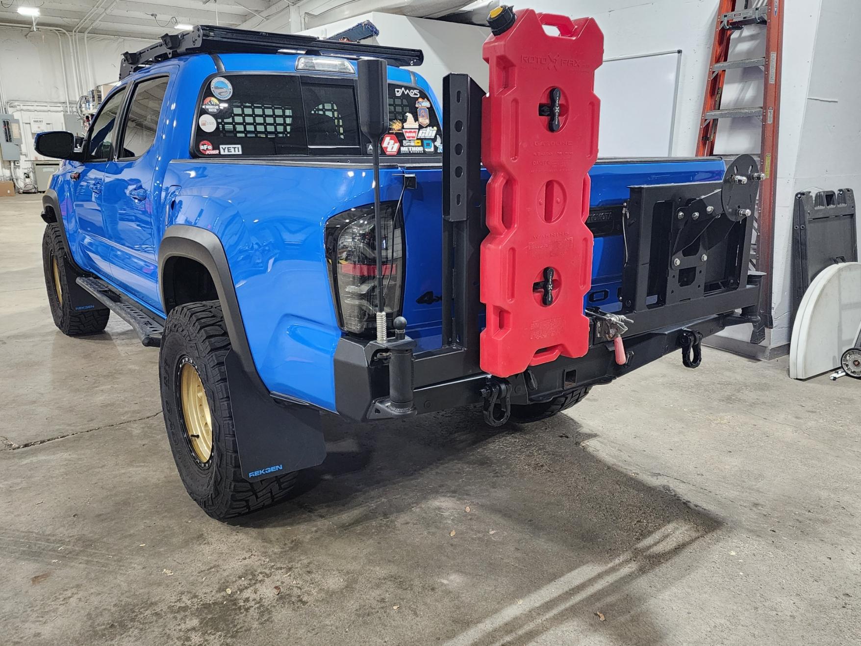 The truck rides on a lifted suspension with Old Man Emu BP-51 remote-reservoir shocks and Dakar leaf springs as well as SPC adjustable upper control arms up front and Timbren bump stops on the rear axle. Gold-finished 17″ Method 105 wheels with beadlock rings are mounted with 35×12.50″ Toyo Open Country R/T tires, and a matching spare is stowed in the pickup bed. Braking is handled by power-assisted ventilated front discs and rear drums.