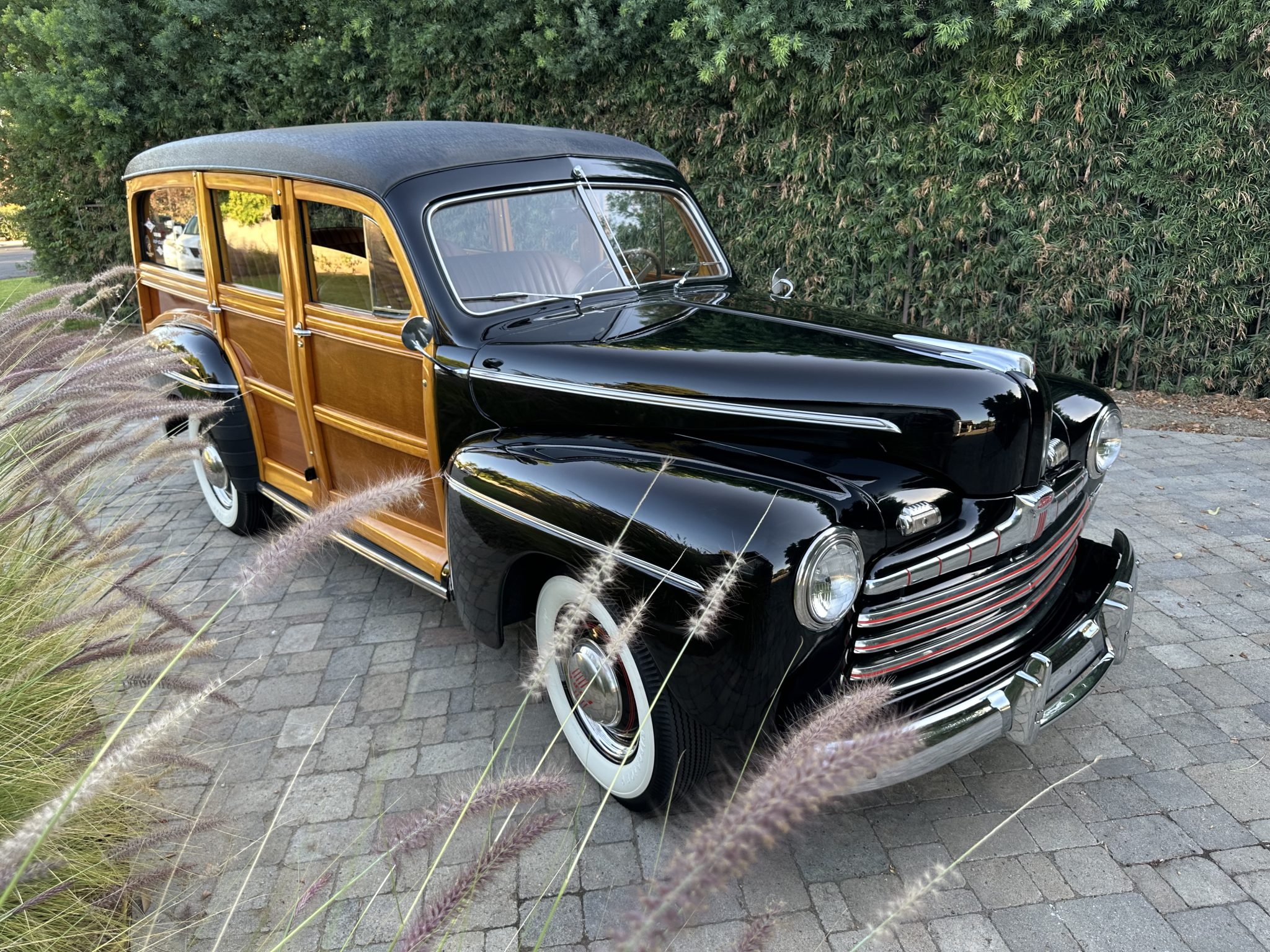 Body-color 16” steel wheels feature hubcaps with trim rings and are mounted with Firestone whitewall tires measuring 6.00-16. A spare is housed in a body-color cover attached to the tailgate. The car was factory equipped with front and rear transverse leaf springs, and braking is provided by hydraulically actuated front and rear drums.