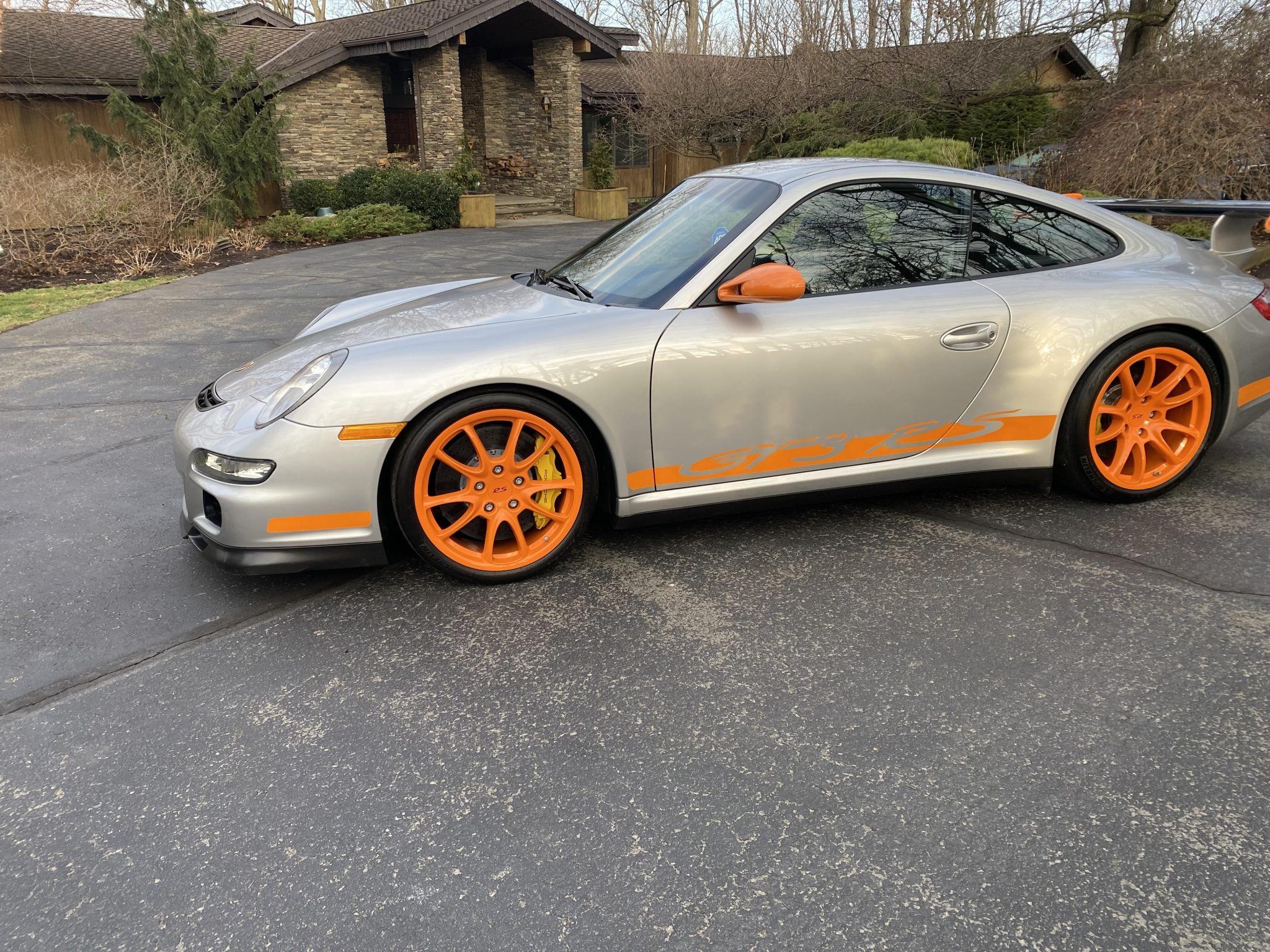 The 19″ orange-finished alloy wheels are mounted with Michelin tires showing 2012 date codes. Braking is handled by Porsche-branded six-piston front and four-piston rear calipers over carbon-ceramic rotors. The GT3 RS was factory equipped with Porsche Active Suspension Management (PASM) featuring adjustable coilovers.