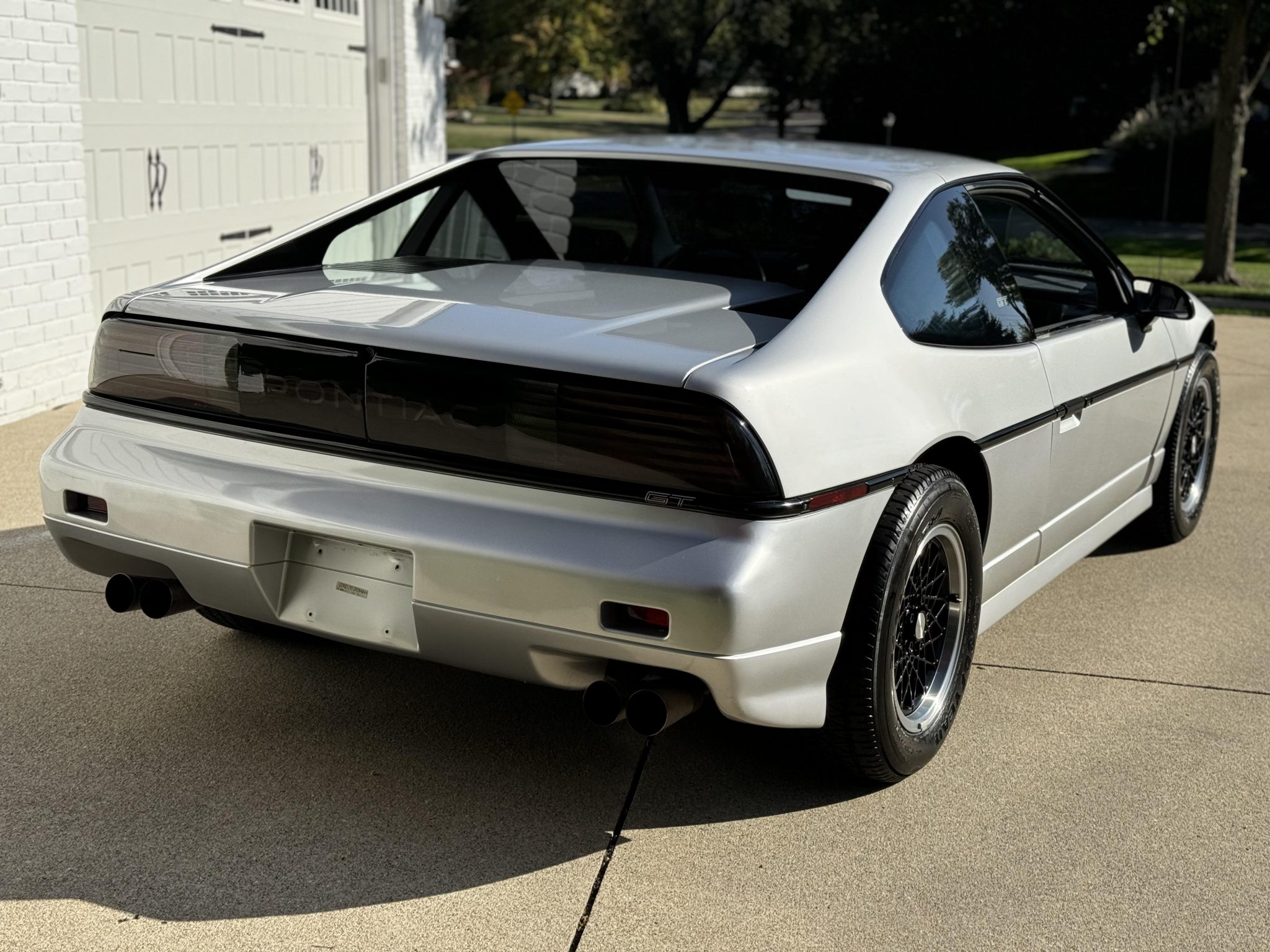 Black-finished 15″ diamond-spoke alloy wheels are mounted with an older set of Goodyear tires. Stopping power is provided by power-assisted disc brakes at all four corners.