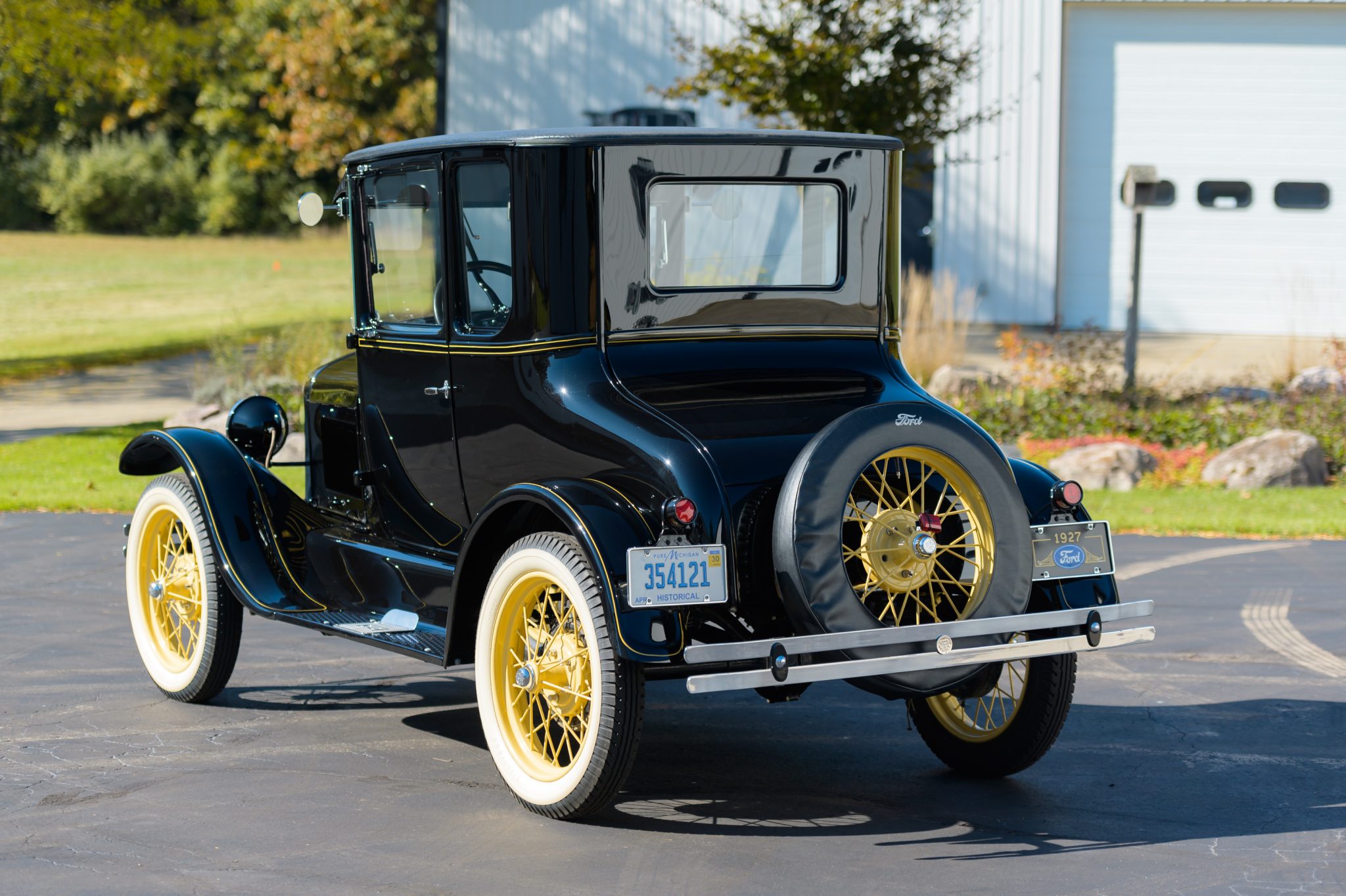Yellow-painted 21″ wire wheels are mounted with Firestone Gum Dipped wide-whitewall tires measuring 4.40/4.50-21. A matching, covered spare is mounted out back. The car has rear drum brakes.