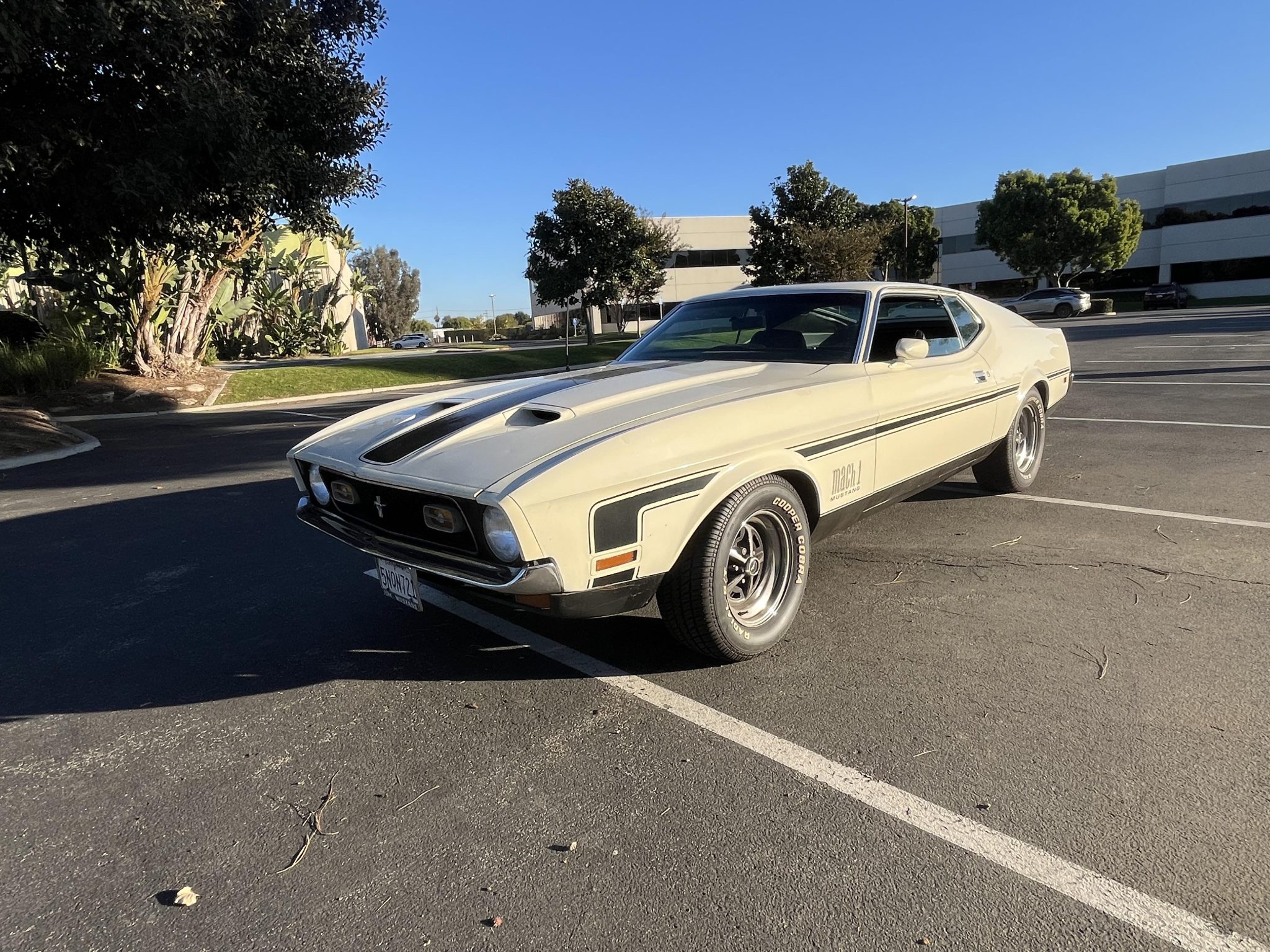 The 14″ Magnum 500–style wheels are mounted with Cooper Cobra white-letter tires. Braking is handled by power-assisted front discs paired with rear drums, and the brake master cylinder is said to have been replaced in 2024.