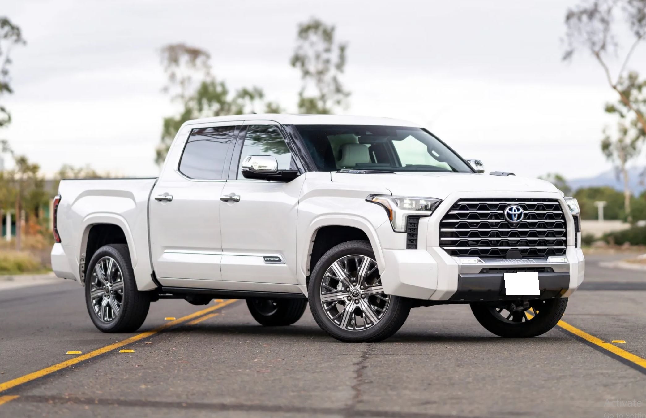 Machine-finished 22″ wheels with dark chrome-finished accents are wrapped in 265/50 Bridgestone Dueler H/T tires. The truck rides on an independent double-wishbone front suspension and a multi-link rear suspension with coil springs. Stopping power is provided by anti-lock disc brakes with ventilated rotors, dual-piston front calipers, and integrated regenerative braking.