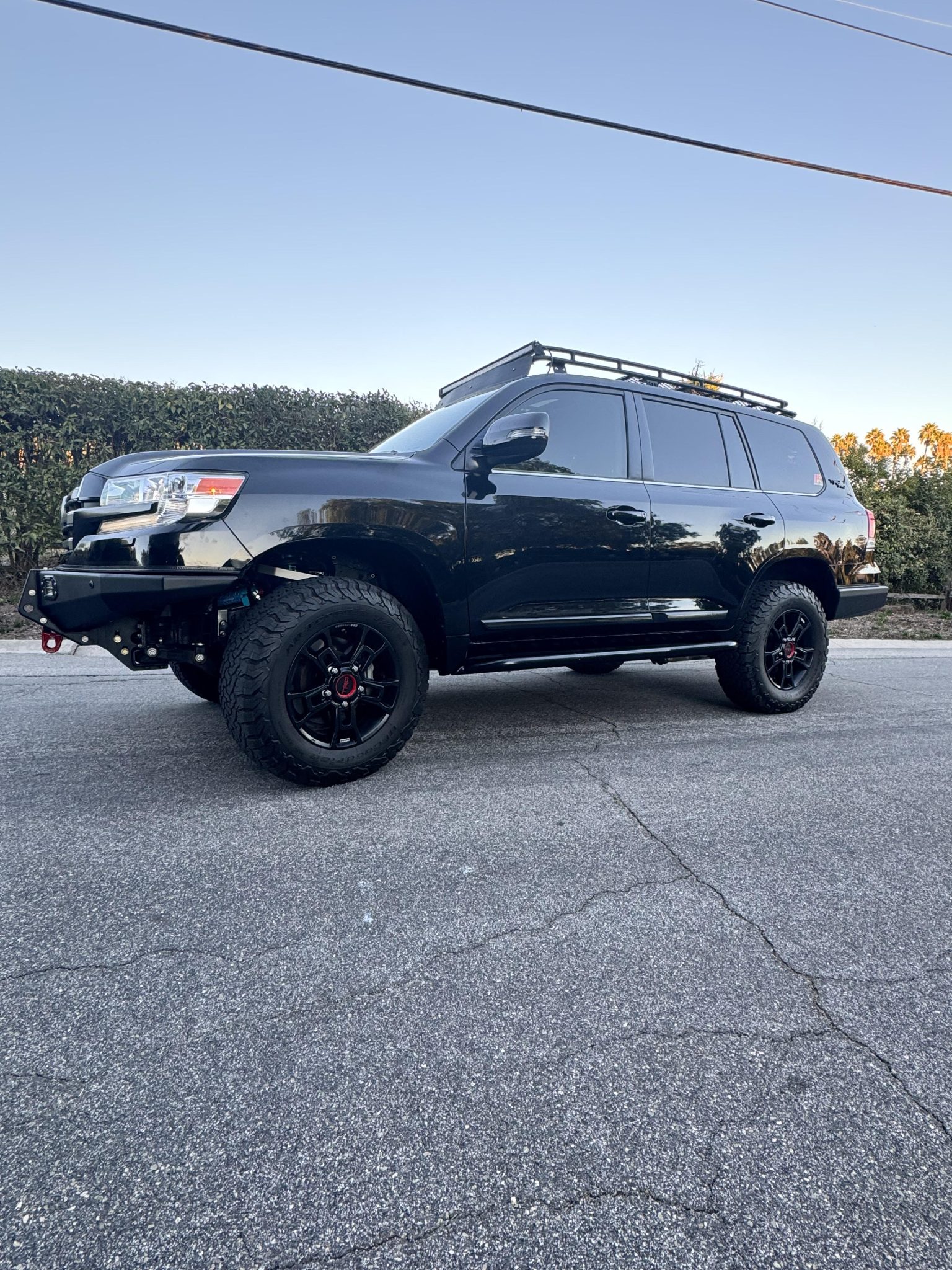The 18″ Toyota TRD Pro wheels are mounted with 275/70 BFGoodrich All-Terrain T/A tires. The truck was modified in 2021 with a two-inch lift kit, Icon Vehicle Dynamics upper control arms and rear trailing arms, King front shocks with remote reservoirs, Airbag Man rear airbags, and a Dobinsons sway bar under previous ownership. Braking is provided by ventilated discs at each corner. Skid plates cover the front suspension, radiator, fuel tank, and transfer case.