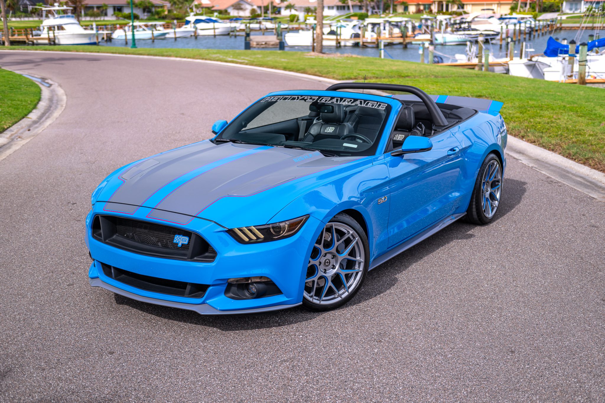 The 20″ HRE wheels are mounted with Continental ExtremeContact tires measuring 255/35 up front and 275/35 out back. The car features Petty’s Garage lowerings springs, adjustable sway bars, and a wheel hop reduction kit, and stopping power is provided by Wilwood calipers and drilled disc brakes fitted at each corner.