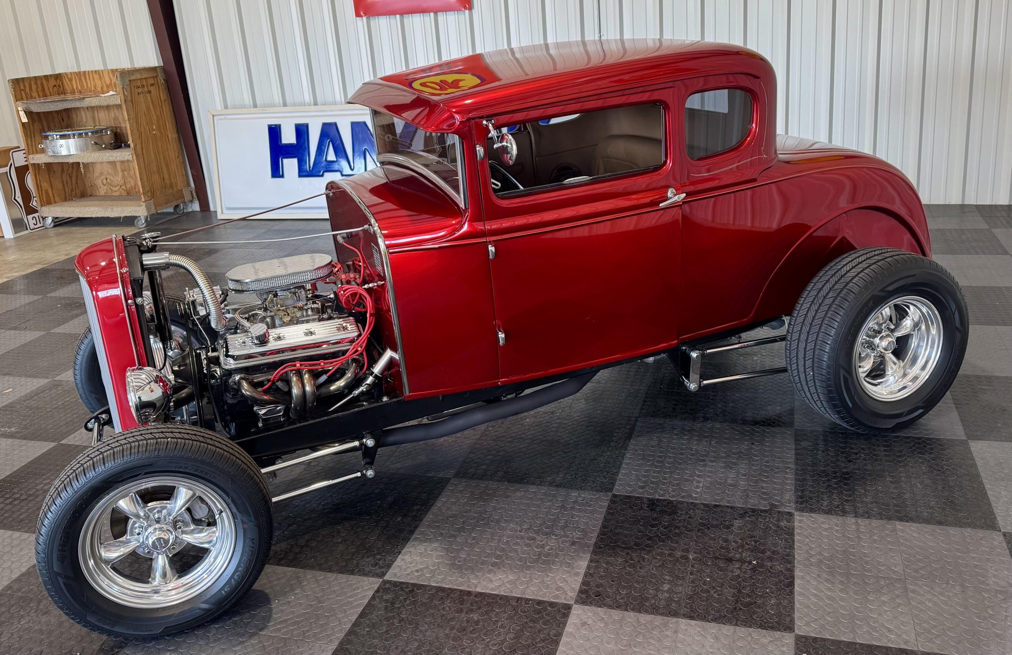 The car rides on a TCI frame with a four-link rear end, radius rods with a transverse leaf spring and a drop axle up front, and chromed Wilwood disc brakes. It rides on 15″ Torq Thrust wheels, which were mounted in September 2024.