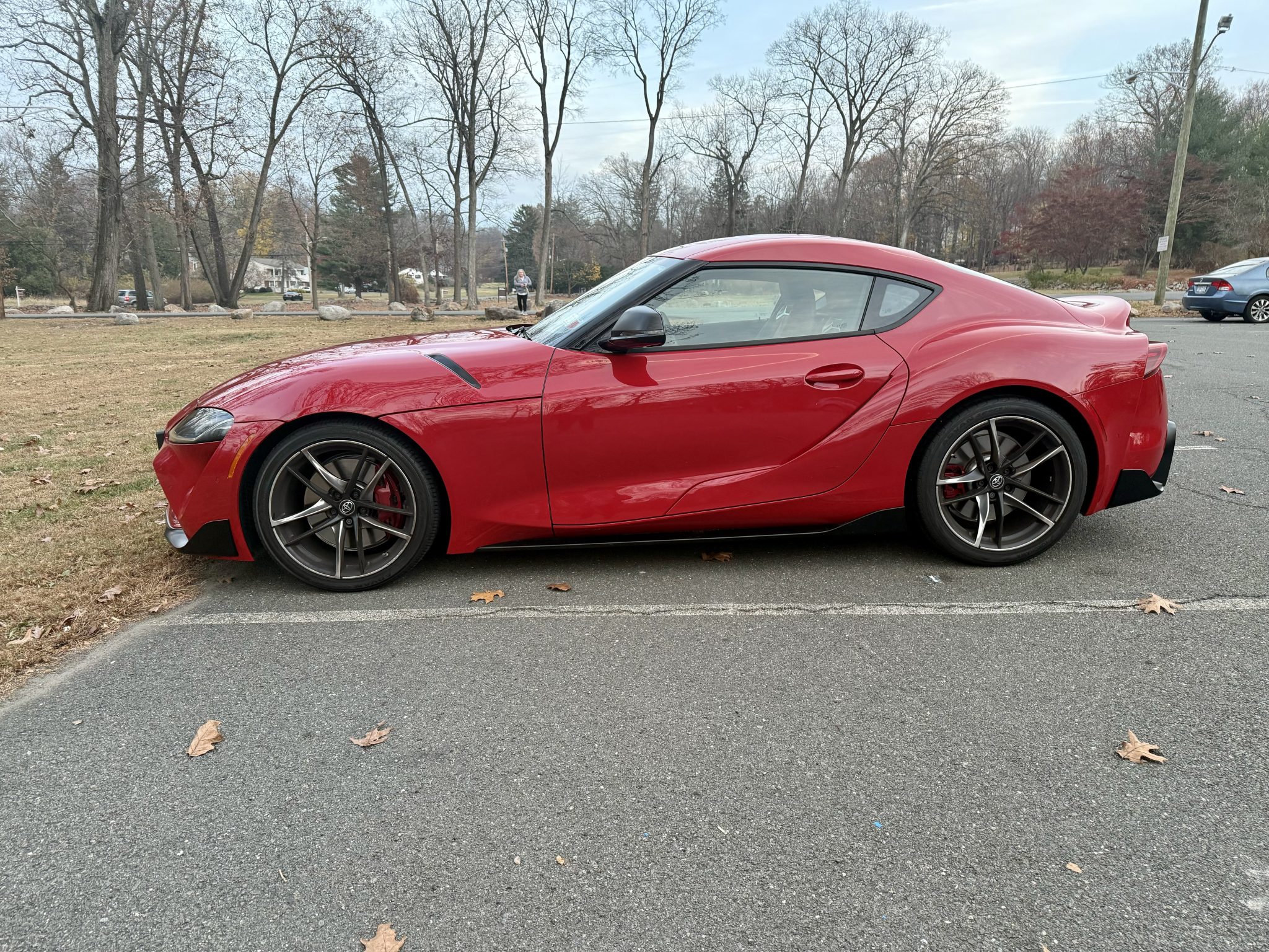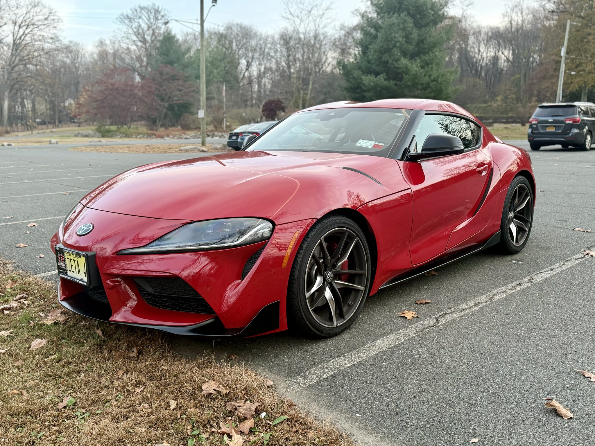 The 19″ forged aluminum wheels are mounted with Yokohama Advan tires. The car features an adaptive variable sport suspension, and braking is provided by four-wheel discs with Supra-branded Brembo four-piston calipers up front.