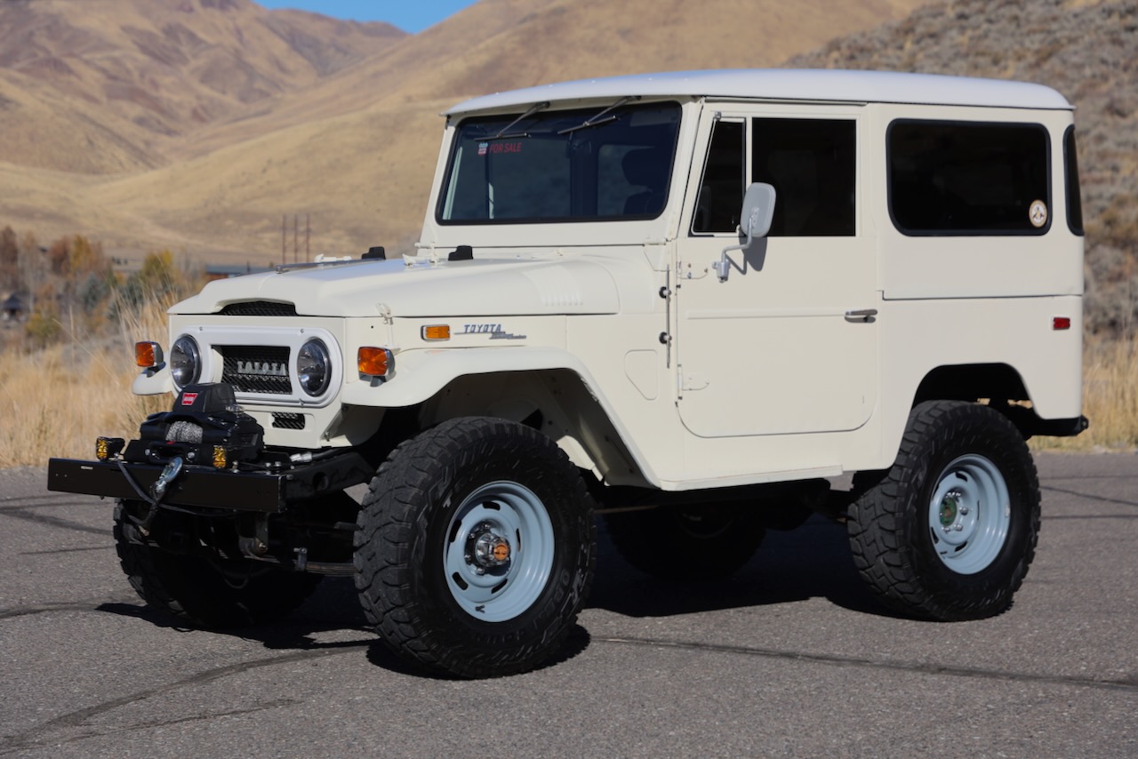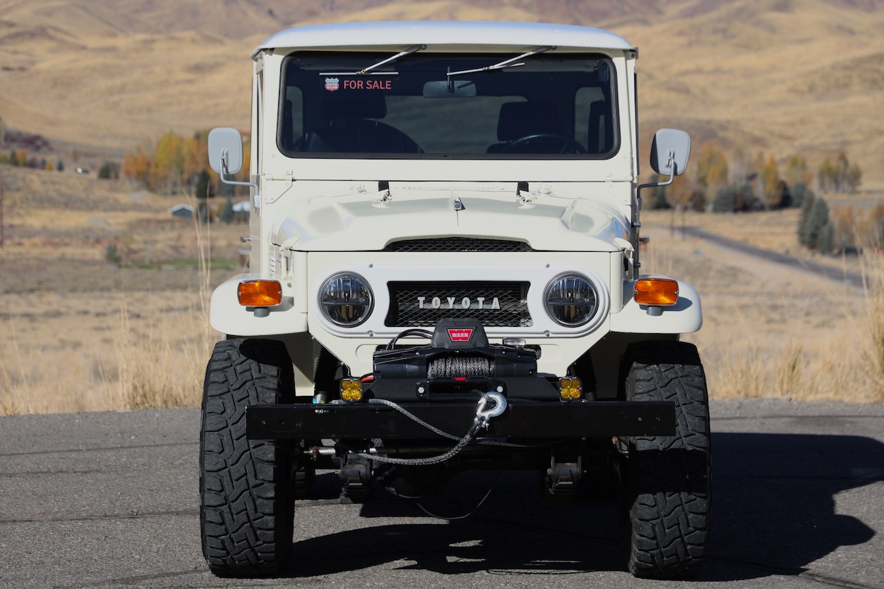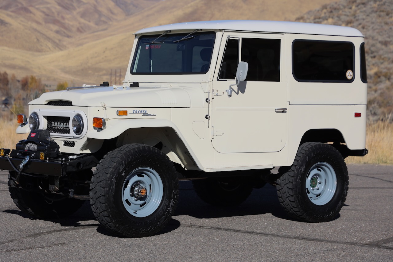 Gray 16″ steel wheels are mounted with 285/75 Toyo Open Country R/T tires, and a matching spare is affixed to the swing-away tire carrier. The truck is equipped with manually locking front hubs and power steering. Braking is handled by discs at all four corners, and a replacement master cylinder and booster were installed in September 2024 along with Bilstein shock absorbers.
