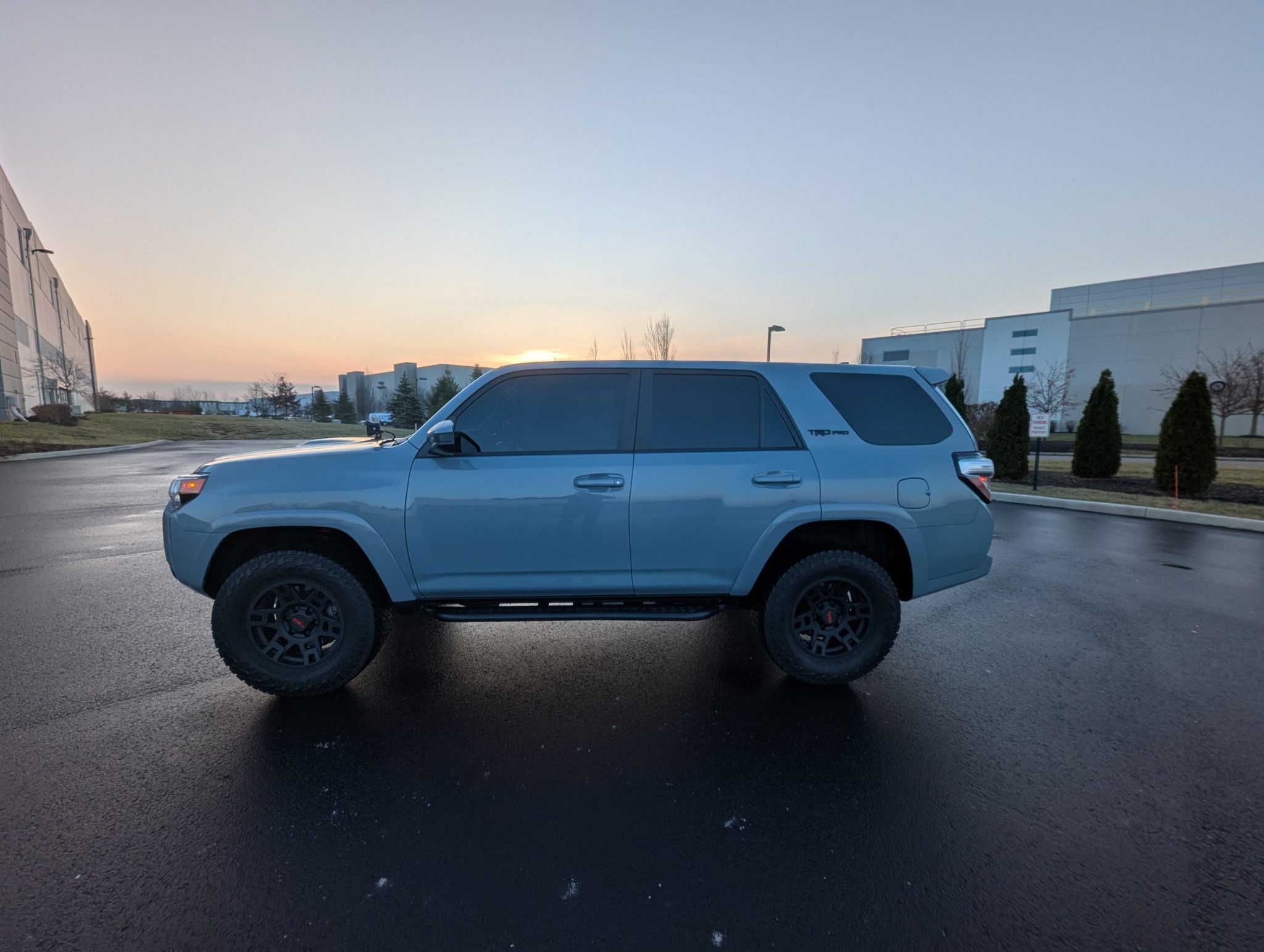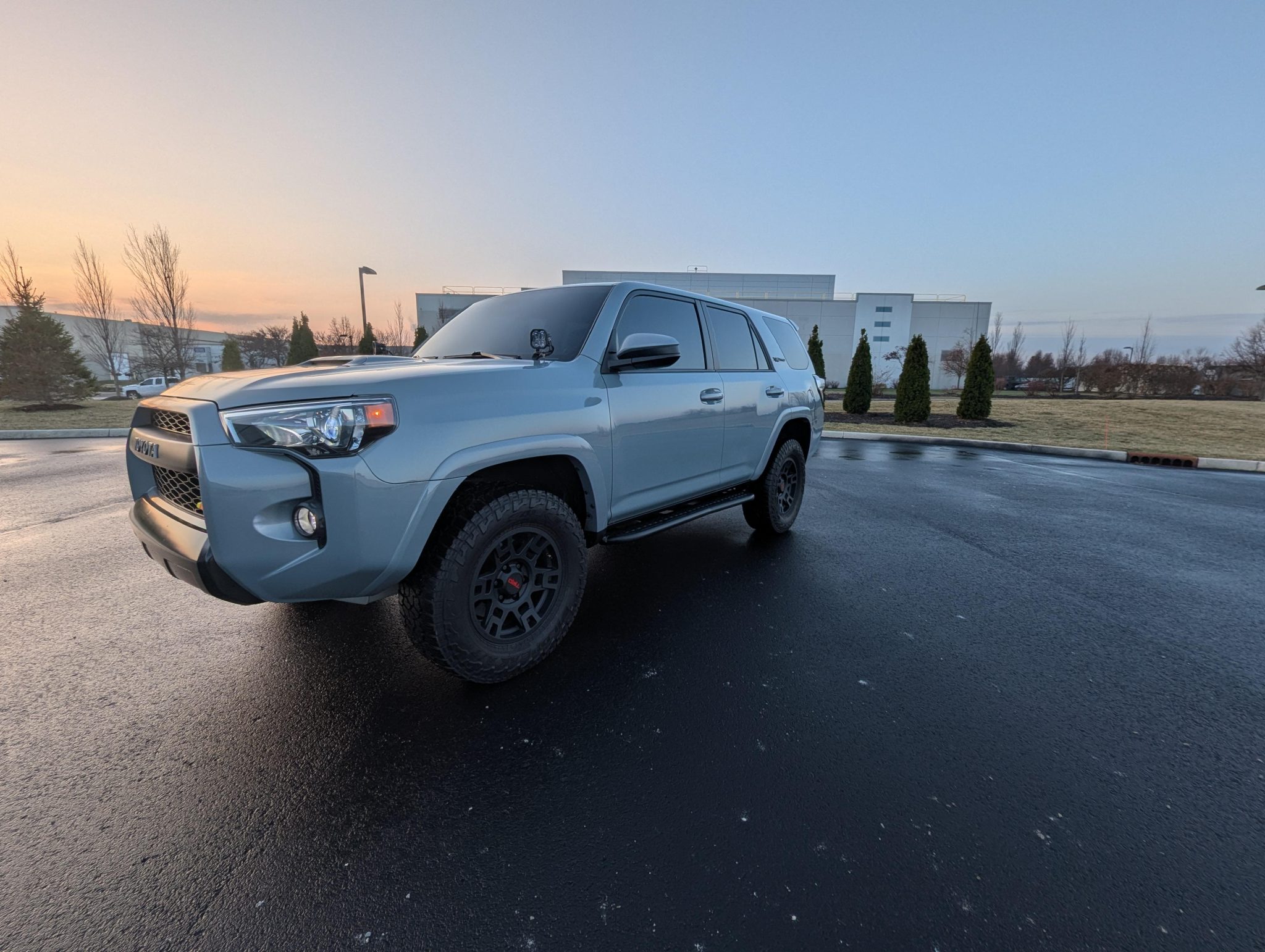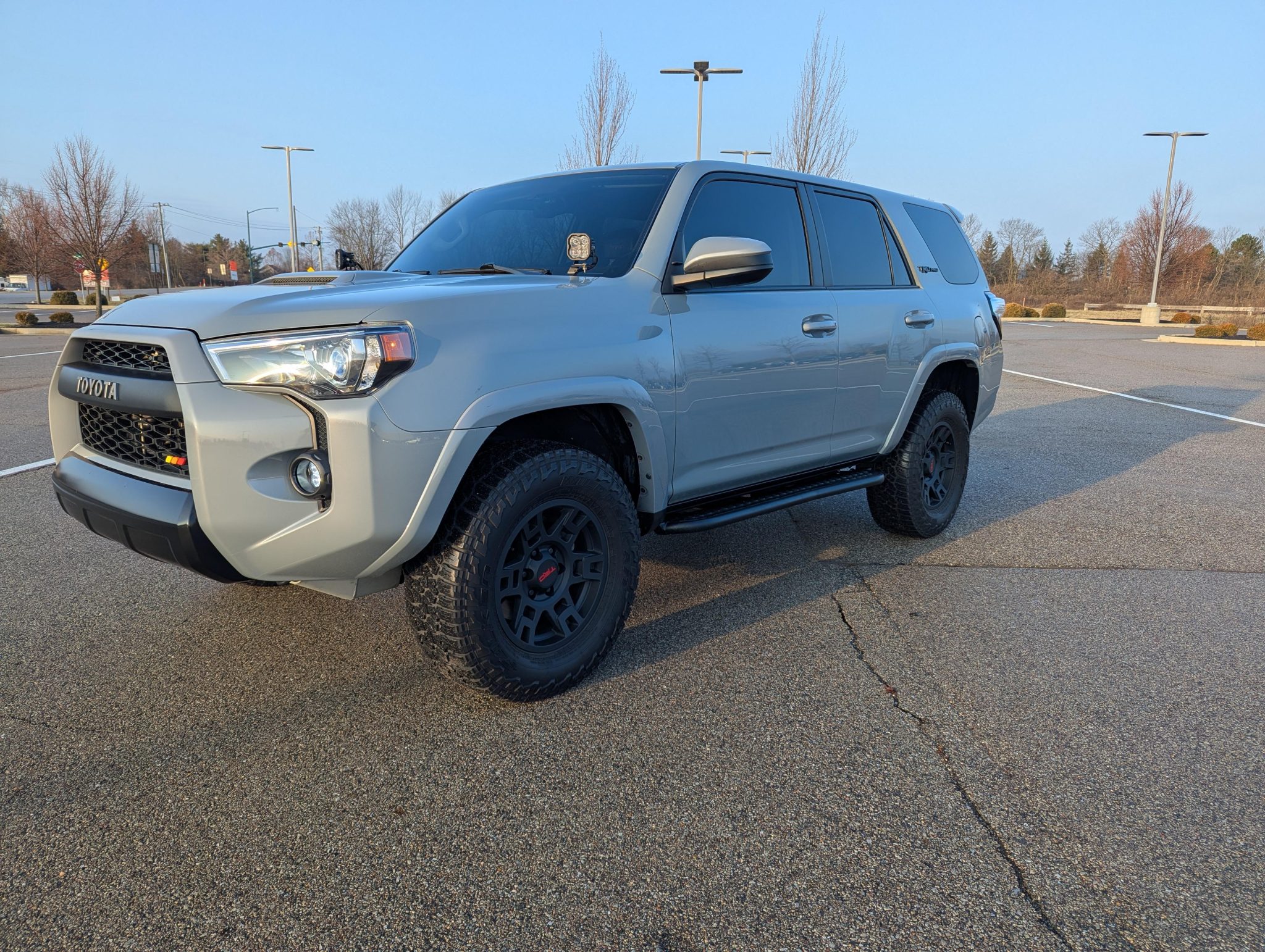 Matte black-finished 17″ wheels wearing TRD-branded center caps were mounted with 265/70 Falken Wildpeak A/T3W tires in March 2023. Braking is provided by anti-lock ventilated discs at each corner. The seller states that the suspension has been modified with 2023 4Runner TRD Pro-specification Fox dampers.