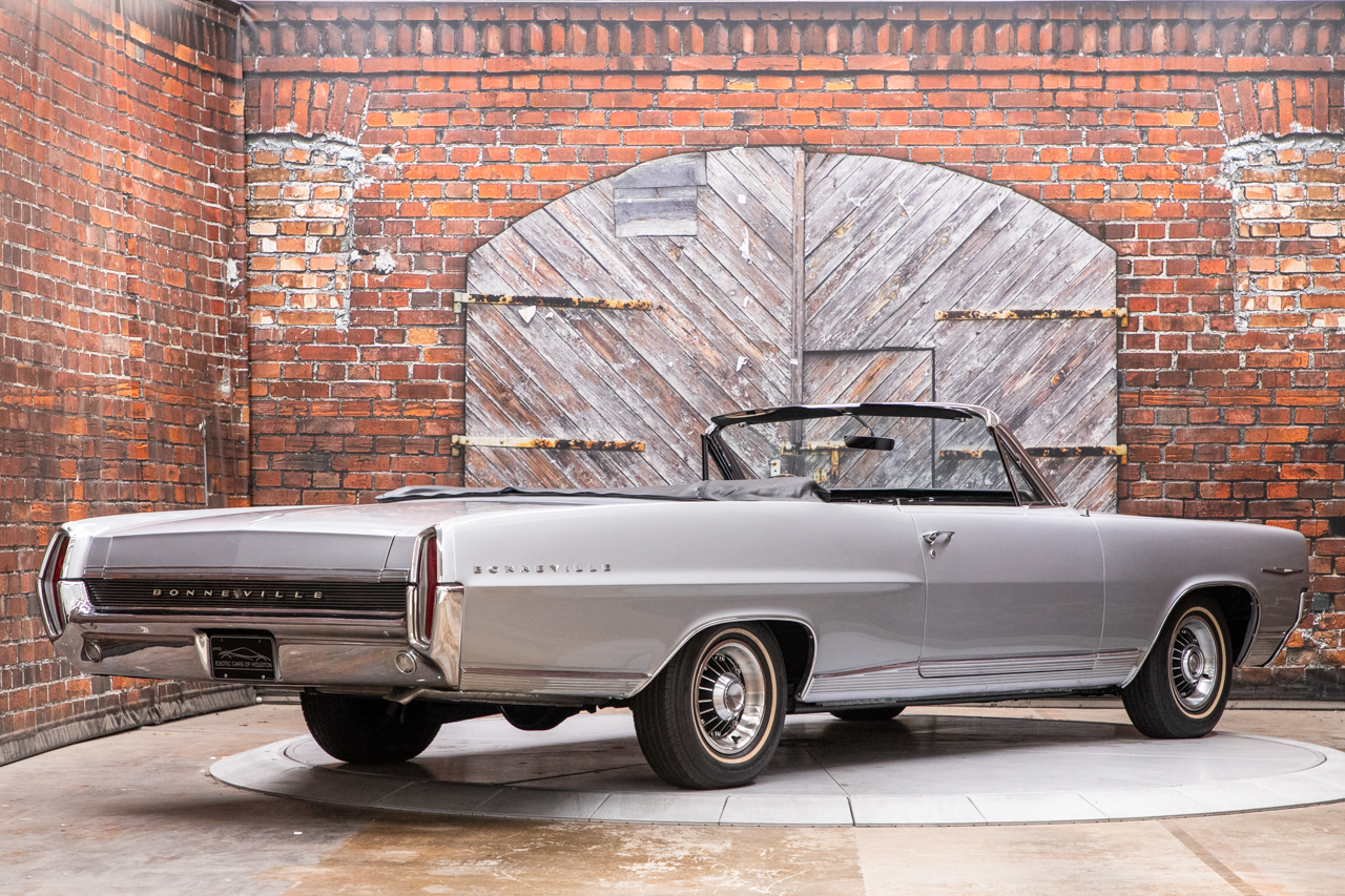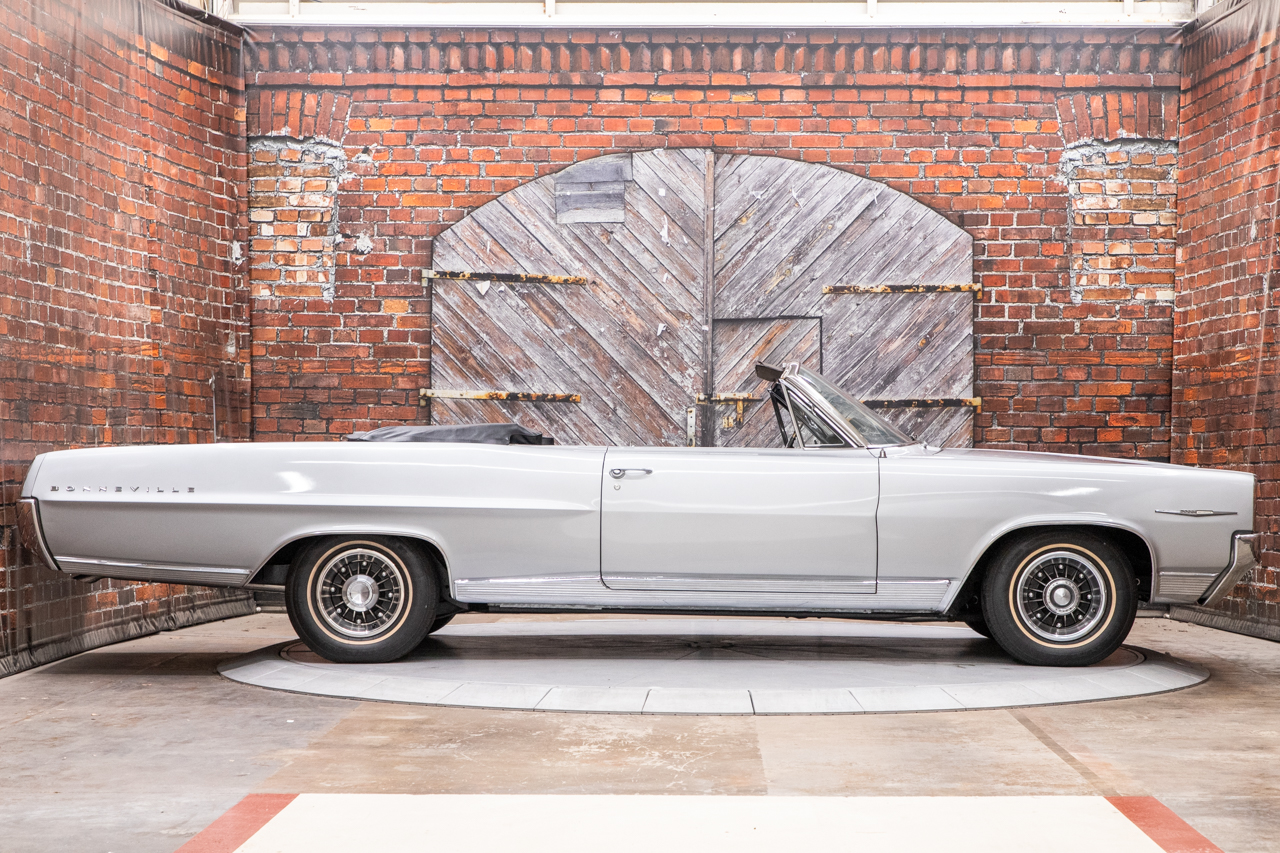 Eight-lug 14″ wheels wear Pontiac Motor Division covers and are mounted with 225/75 Cooper Trendsetter white-stripe tires. The car was equipped from the factory with power steering and power brakes. The brakes were serviced in 2021, and work under current ownership involved overhauling the suspension and replacing the rear springs.