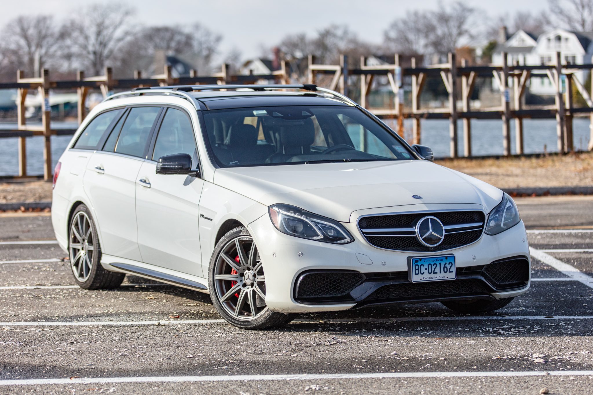 Silver 19″ AMG 10-spoke alloy wheels are mounted with Pirelli Sottozero Serie II tires. A gouge is present on the rear-left tire’s sidewall. The car features an AMG Adaptive Sport Suspension with rear air springs and three driver-selectable modes. Control arms are said to have been replaced under current ownership, and the cross-drilled and slotted brake rotors were replaced in December 2024. A set of four Michelin Pilot Sport A/S 3+ tires said to have been purchased in July 2021 are included in the sale.