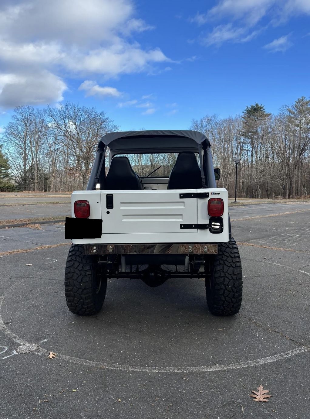 Polished 15″ Pro Comp wheels are mounted with 35×12.5″ Cooper Discoverer STT Pro tires. The Jeep is equipped with manually locking front hubs, power steering, an SPOA suspension lift, and a YJ steering box and springs. Braking is handled by power-assisted front discs and rear drums. The seller states that a high-steer kit was installed along with replacement shock absorbers under previous ownership.