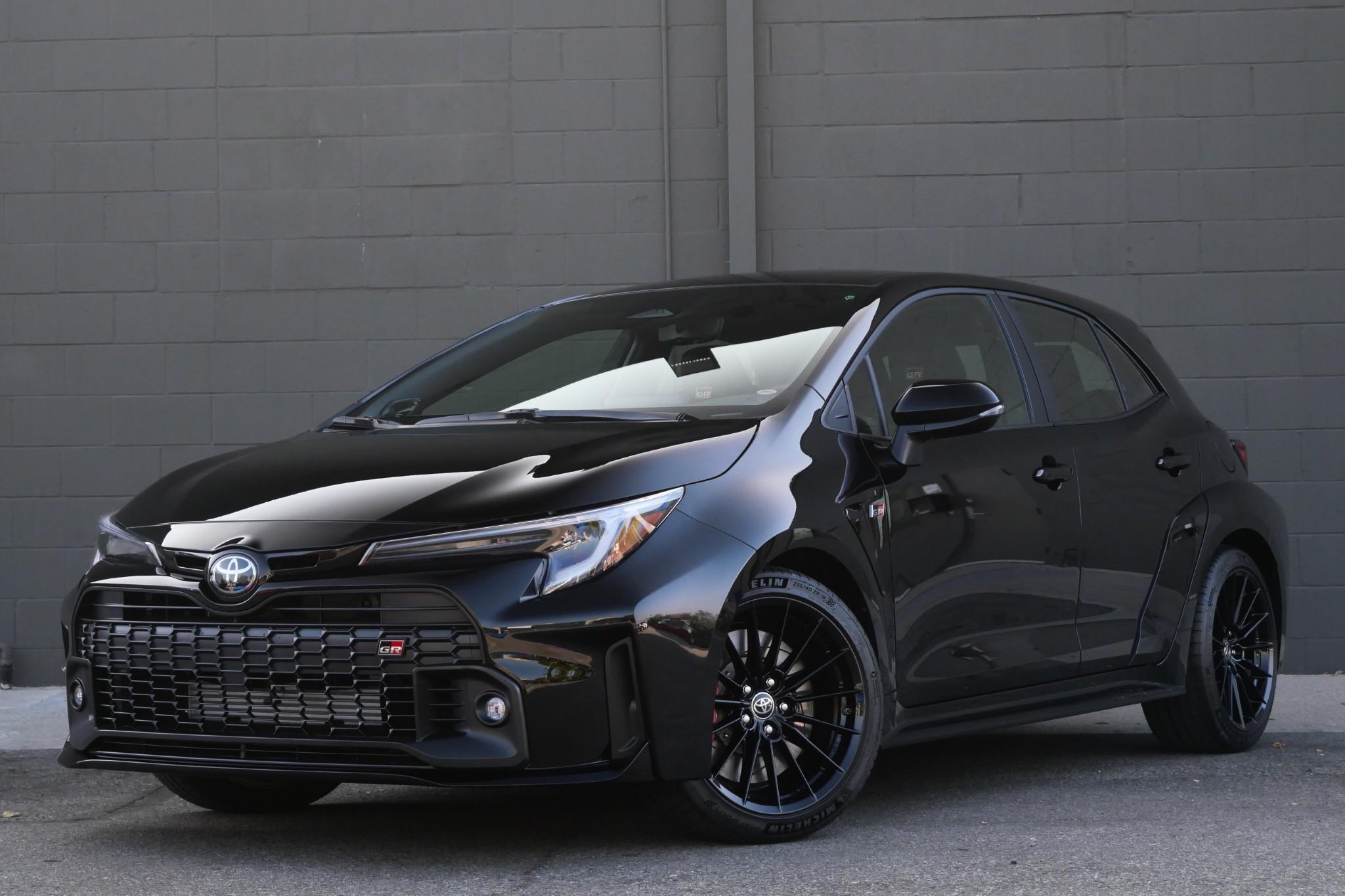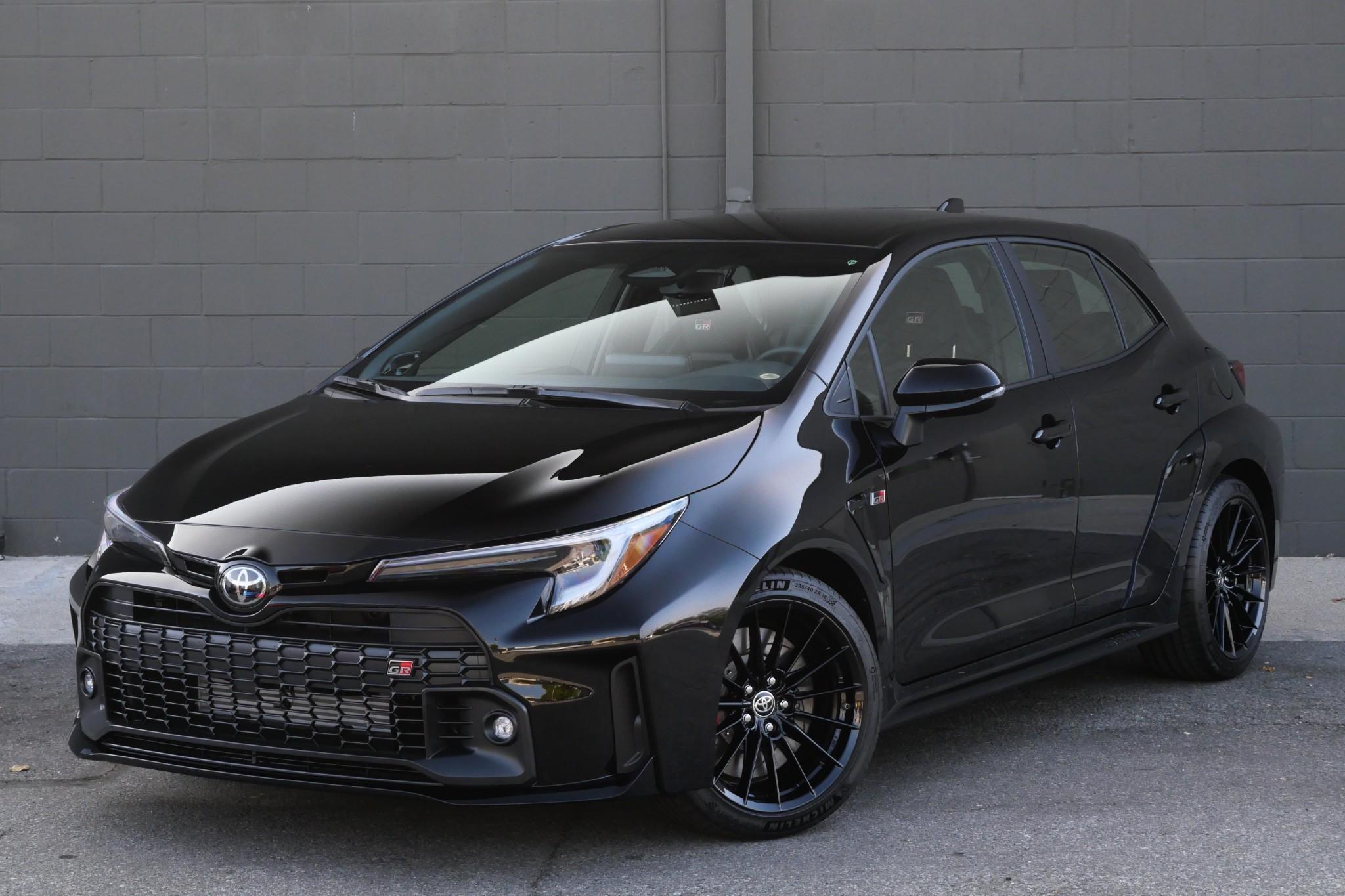 Gloss black–finished 18″ alloy wheels are wrapped in 235/40 Michelin Pilot Sport 4 tires. Braking is handled by red GR-branded four-piston front and two-piston rear calipers over slotted rotors at all four corners.