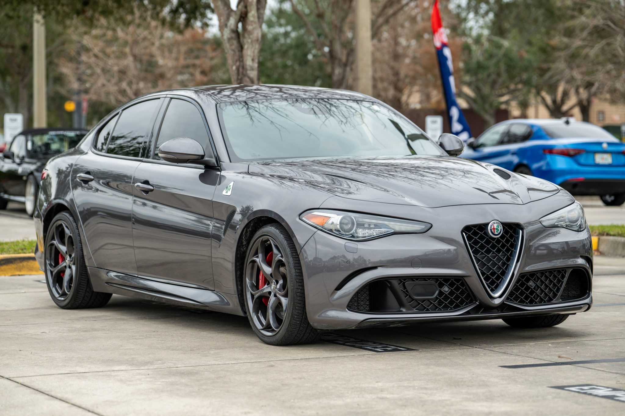Dark-finished 19″ five-hole wheels are mounted with 245/35 front and 285/30 rear Yokohama Advan Sport A/S+ tires showing 2020 date codes. The car rides on an active suspension with three selectable modes, and stopping power is provided by red-finished calipers over Brembo cross-drilled and ventilated discs at each corner.