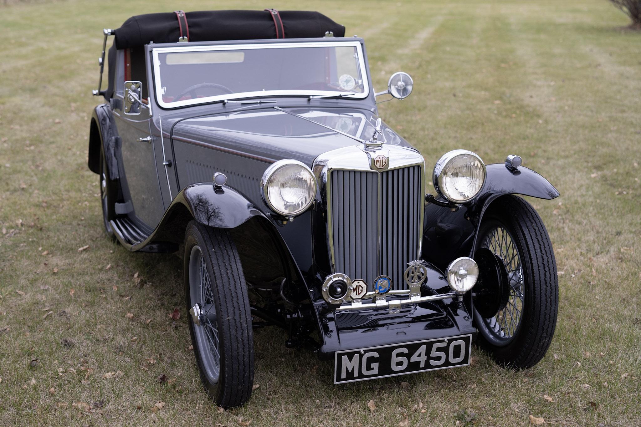 This example was refinished in metallic gun-metal gray with red pinstriping and black fenders during the refurbishment performed between 1987 and 1990, which included repairs to the ash framework and body panels. Features include rear-hinged doors, a badge bar hosting a single driving lamp, a midge radiator mascot, trafficators, a passenger-side spotlamp, a rectangular driver-side mirror, and a black convertible top designed to be used fully open, fully closed, or covering the rear shelf area only. A 1939-expiring UK tax disc is affixed inside the windshield.