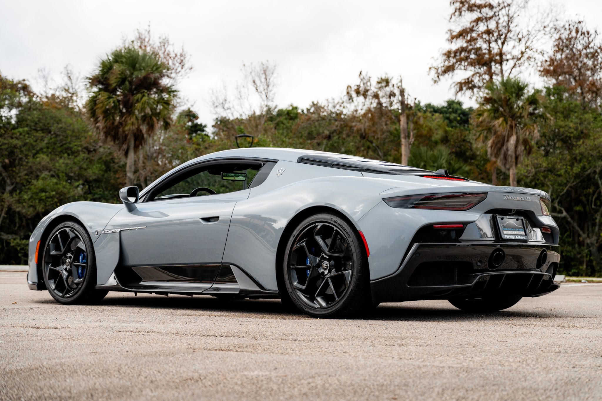 The 20″ Birdcage wheels are finished in Glossy Dark Miron and are mounted with Bridgestone Potenza Sport tires measuring 245/35 up front and 305/30 out back. The car was optioned with carbon-ceramic brakes with blue-finished calipers, and it is also equipped with launch control and a double-wishbone suspension that utilizes active dampers.