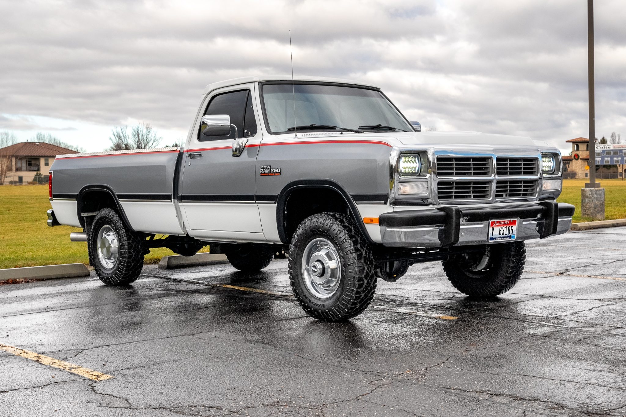 The 16″ steel wheels feature bright hubcaps and are mounted with 235/85 Goodyear Wrangler Duratrac tires. The truck is equipped with manually locking front hubs and power steering, and braking is provided by power-assisted front discs and rear drums.