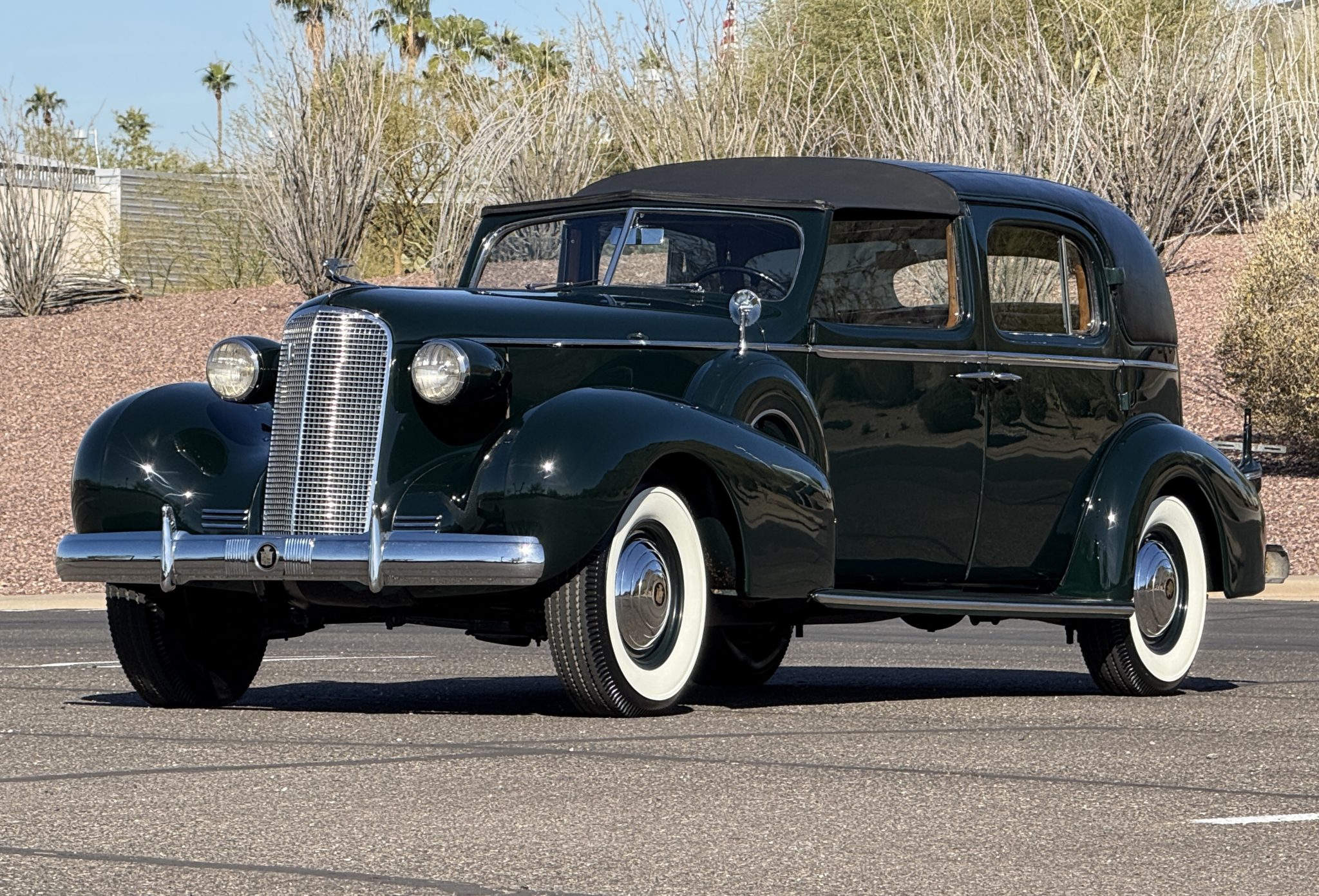 Body-color steel wheels wear chrome Cadillac crest hubcaps and trim rings, and they are mounted with older BFGoodrich Silvertown bias-ply whitewall tires. Twin spare tires are mounted inside body-color covers topped with mirrors in the front fenders. The four-wheel drum brakes were bled and adjusted in 2024.
