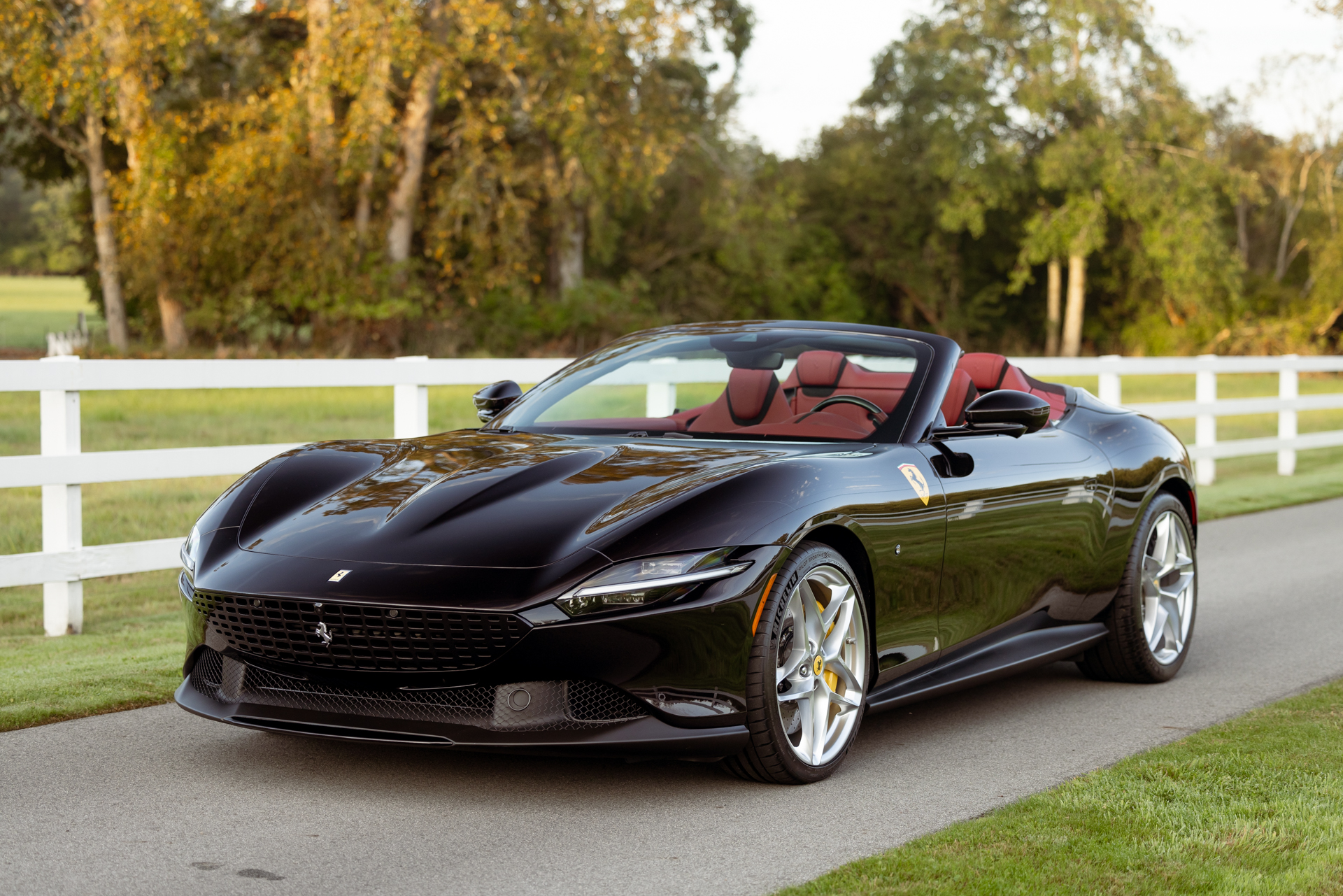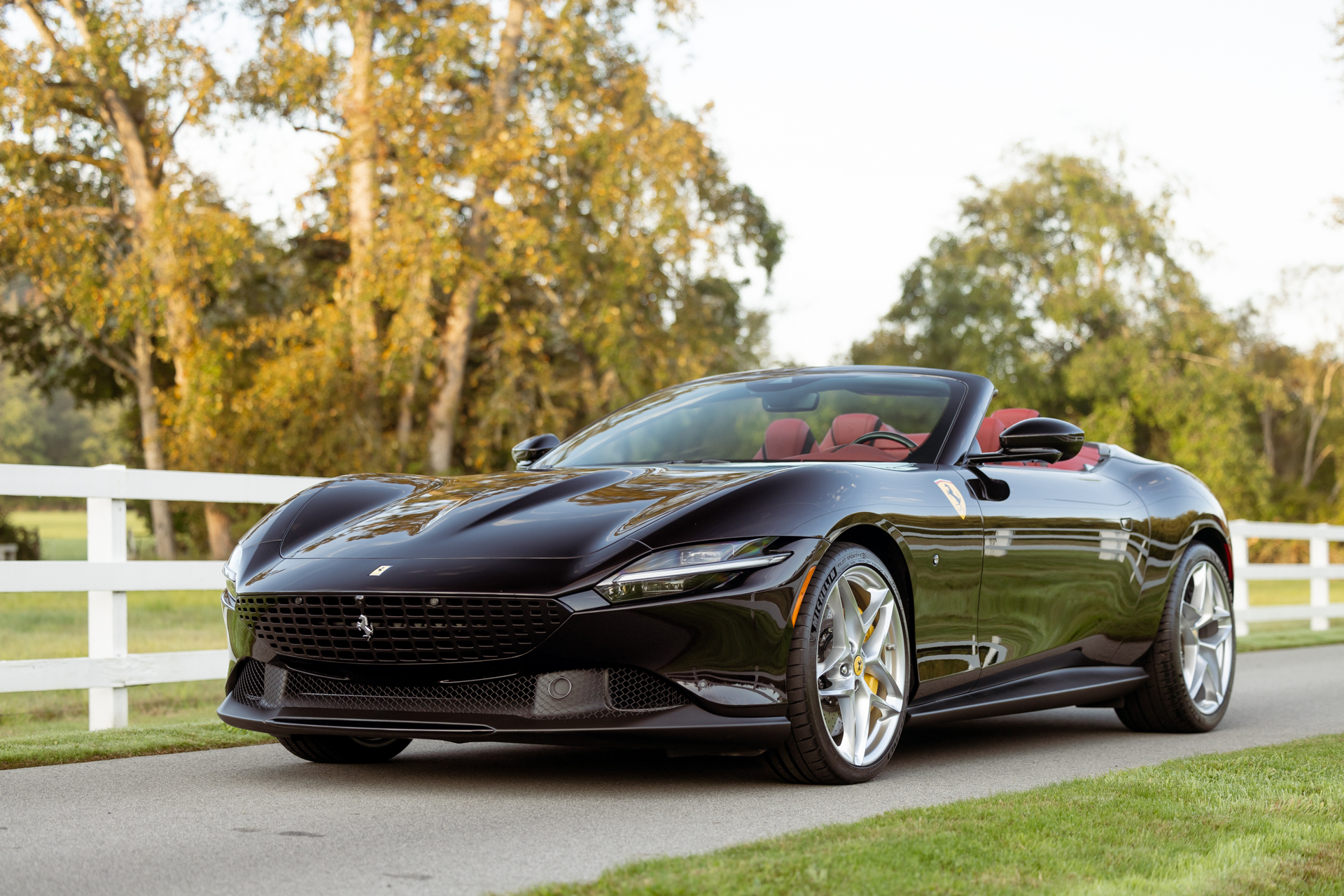 The 20″ alloy wheels are mounted with Michelin Pilot Sport 4S tires measuring 245/35 up front and 285/35 at the rear. A dual-mode MagneRide suspension was optioned from the factory, and braking is handled by yellow-finished, Ferrari-branded Brembo calipers over carbon-ceramic rotors.