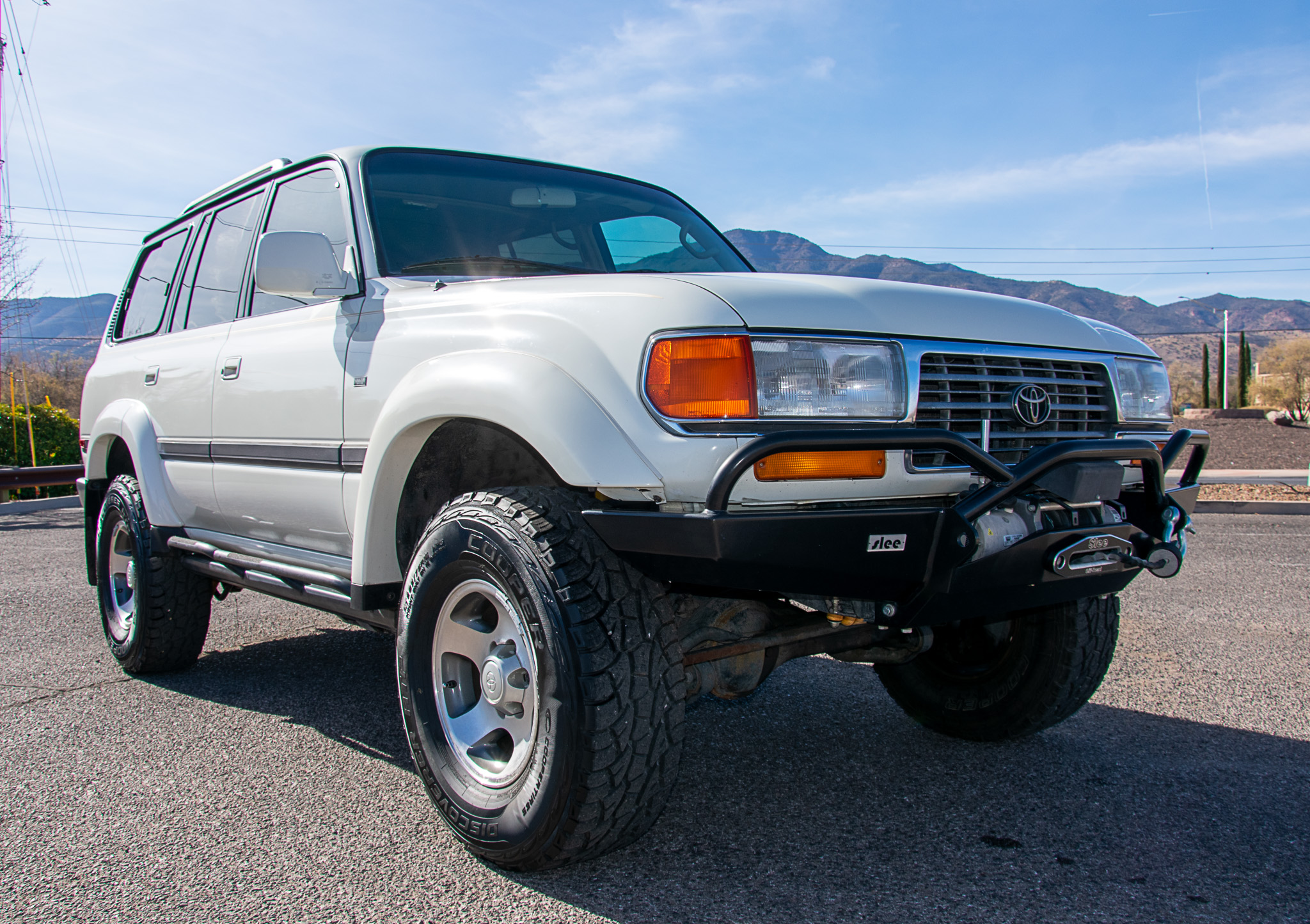 The 16″ alloy wheels are mounted with 285/75 Cooper Discoverer ATP tires. A 2″ Old Man Emu suspension lift and stainless steel brake lines have been fitted, and braking is handled by four-wheel discs with ABS.