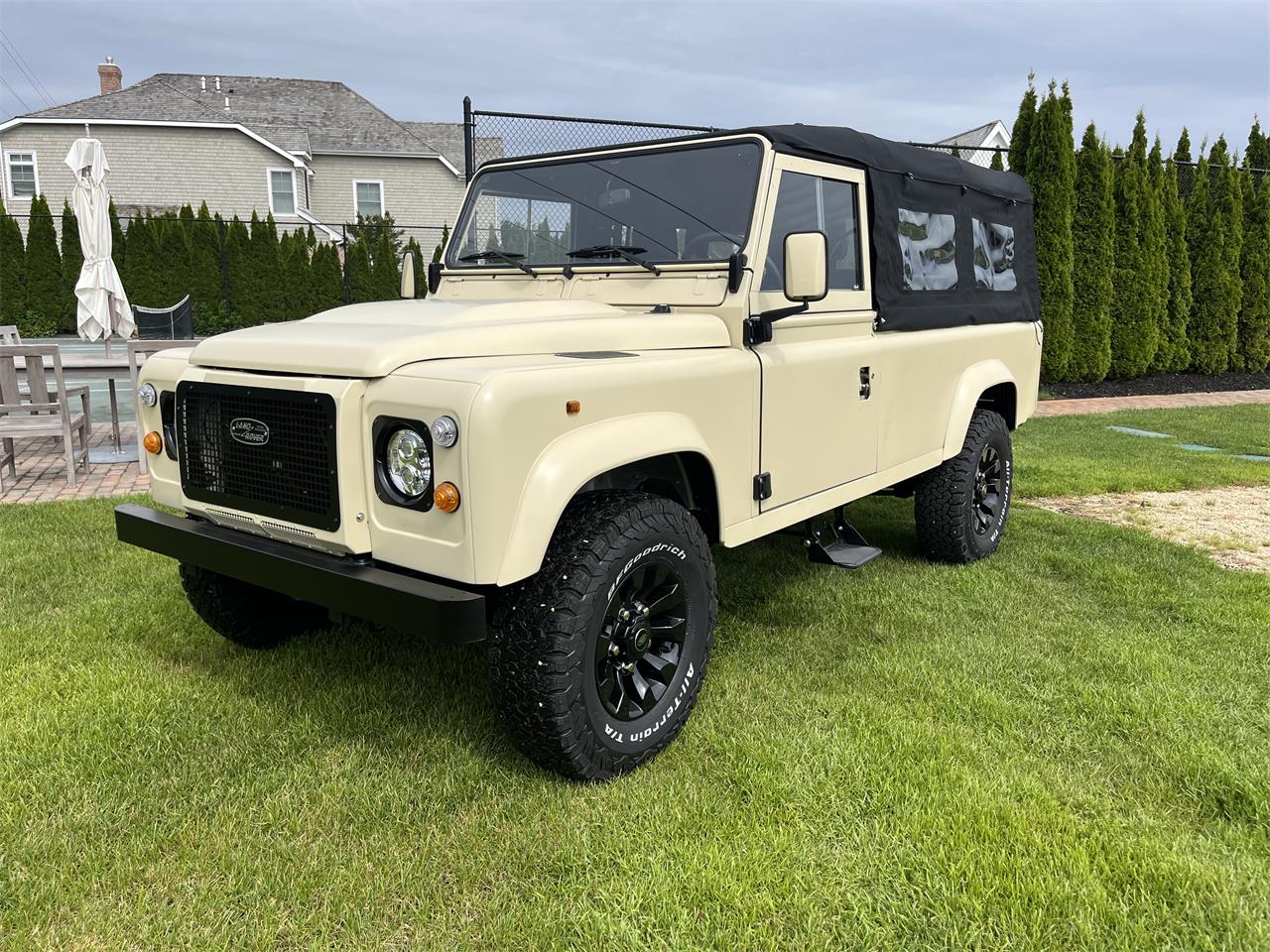 This car will take your breath away! Land Rover Defender 110 Open Top, 300 TDI ENGINE, 2 DOORS, 4 BENCHES, CONVERTIBLE, AIR CONDITIONING, ITALIAN TRIMMED LEATHER INTERIOR, MARSHALL SPEAKER AUDIO, BLACK ALLOY WHEELS, TEAK FLOOR, BIXENON LIGHTS, CUSTOM COLOR completely restored from the chassis