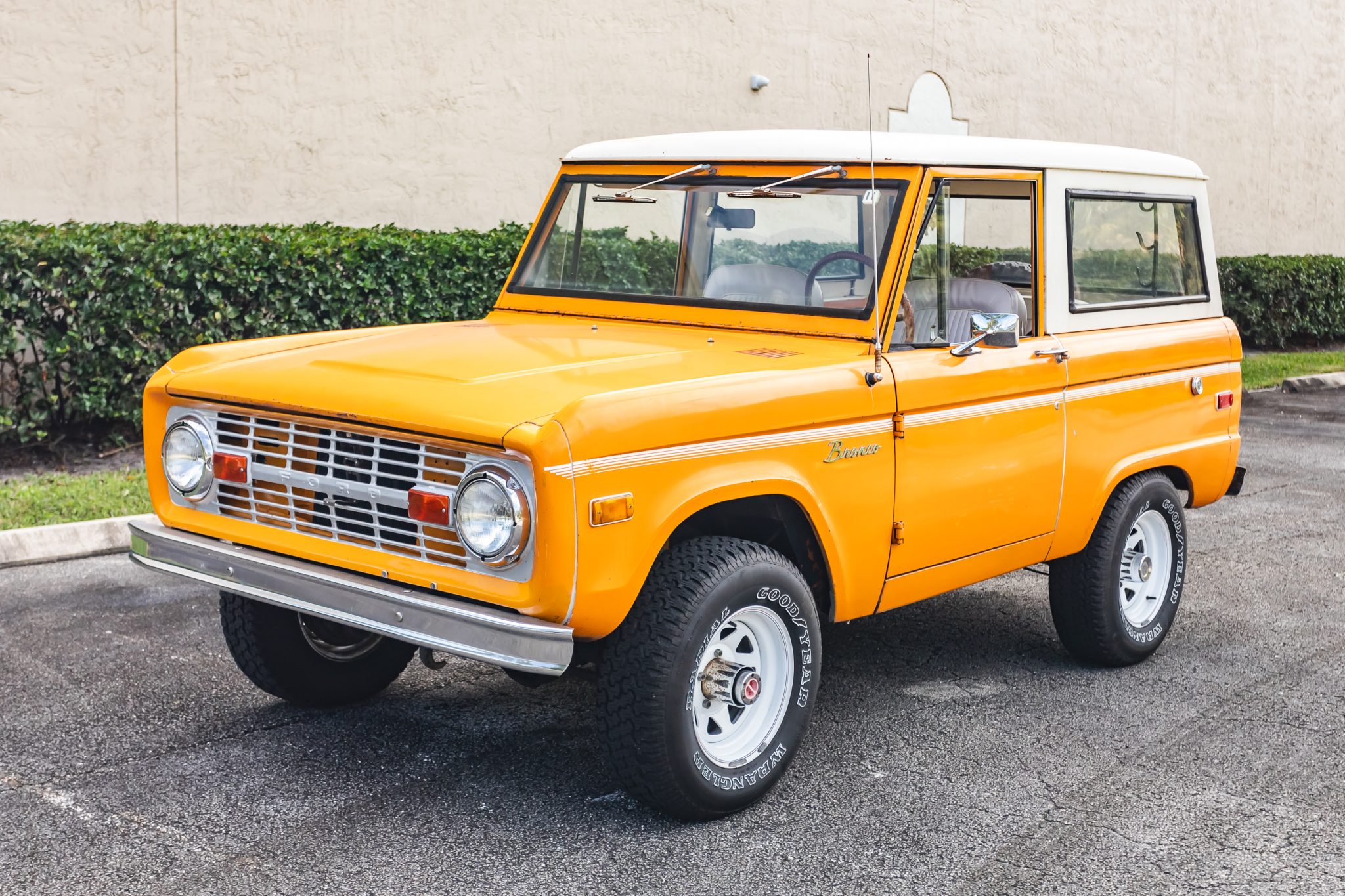 White 15″ steel wheels are mounted with Goodyear Wrangler tires. The truck is equipped with manually locking hubs, and stopping power is provided by drums at each corner.
