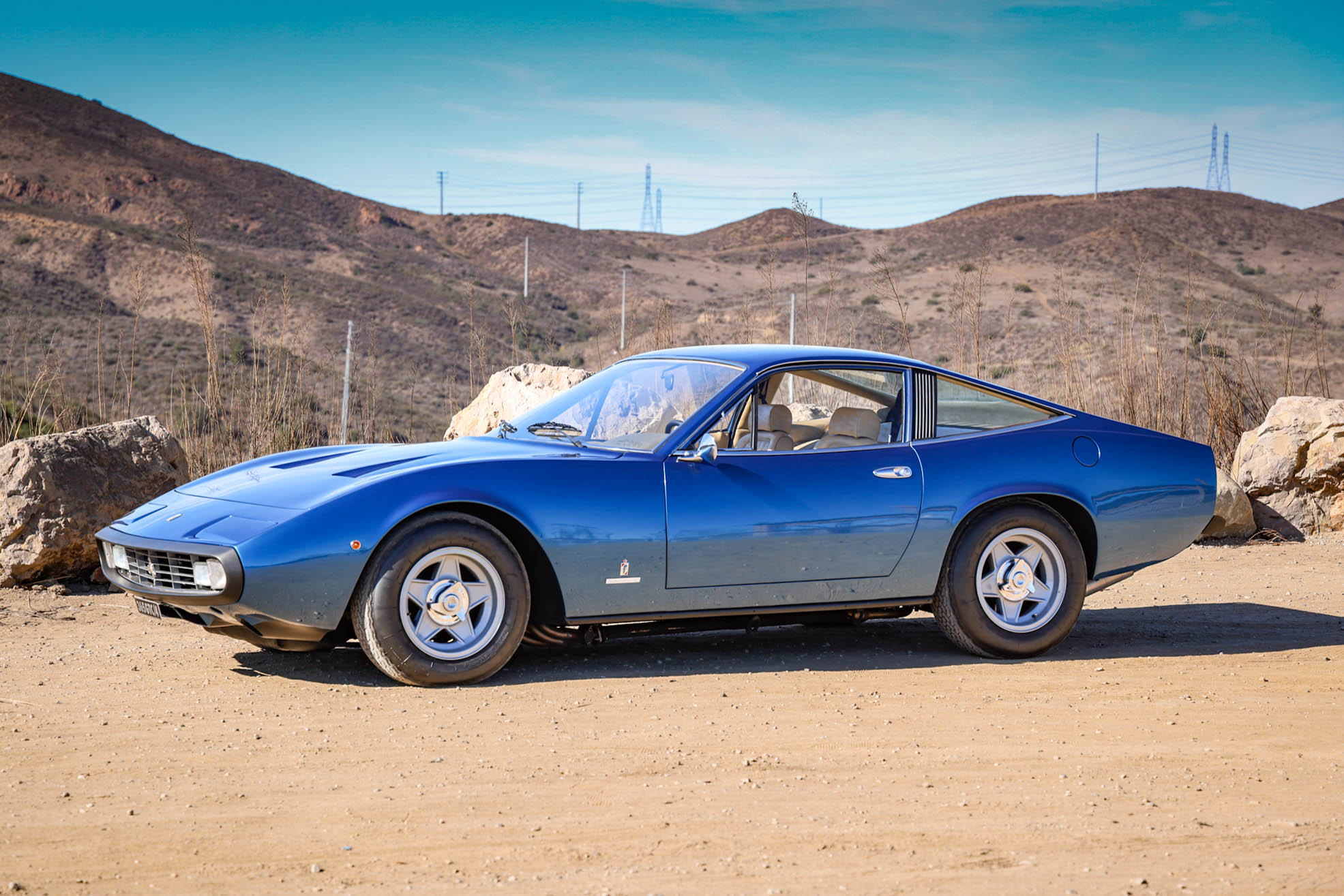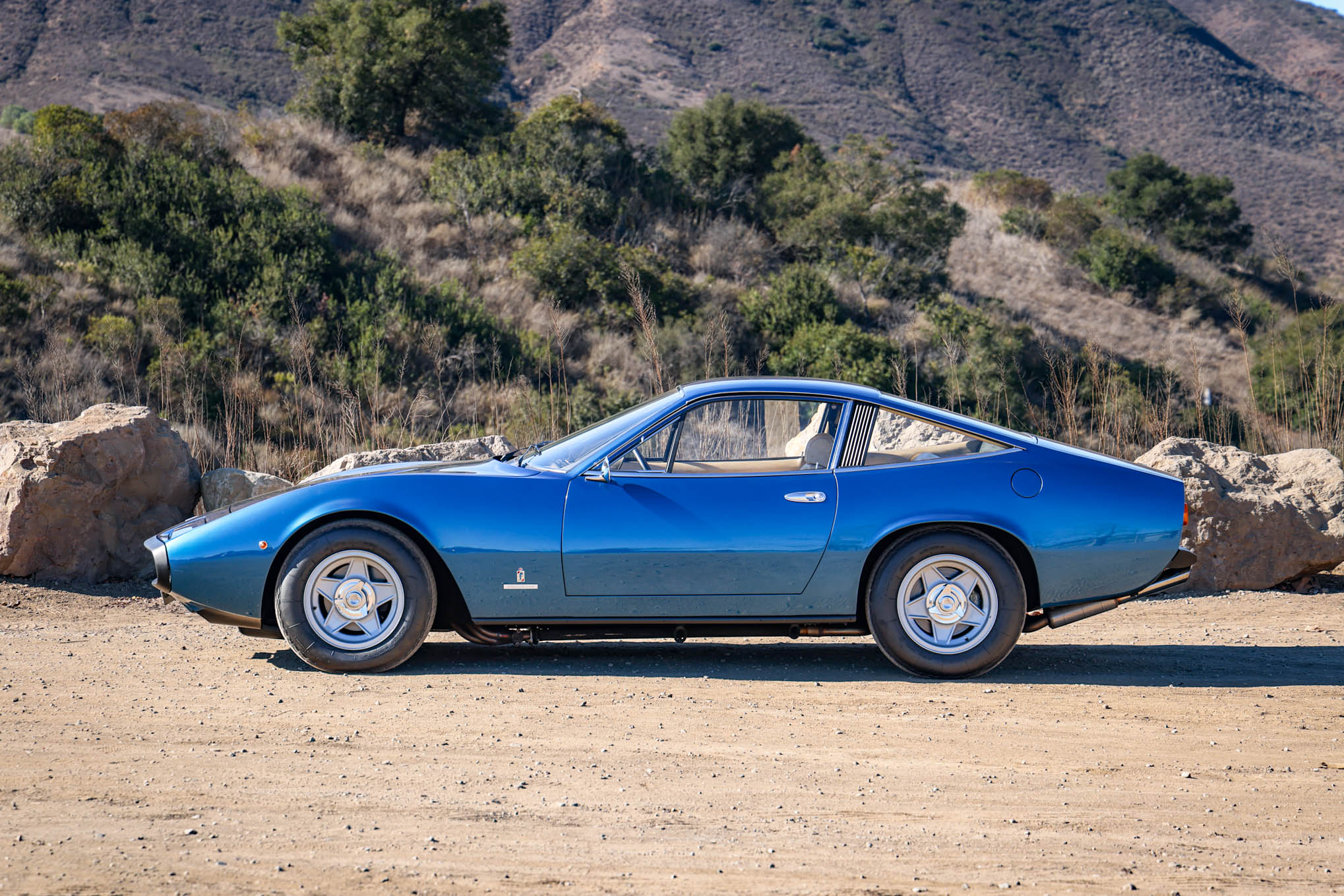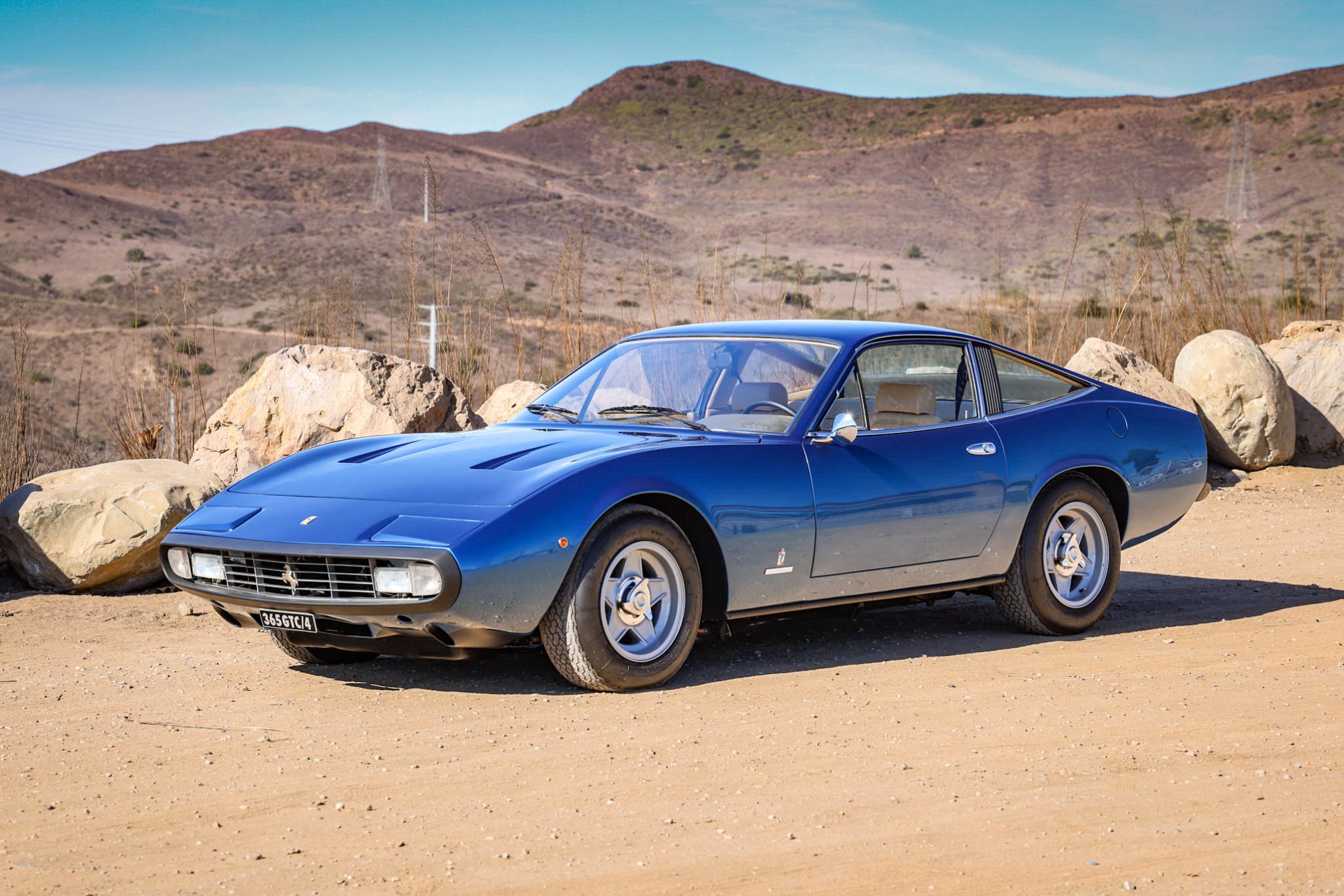 The 15″ five-spoke Cromodora wheels feature three-eared knockoffs and are mounted with 215/70 Michelin XWX tires. A matching spare wheel is mounted beneath the trunk floor. The 365 GTC/4 featured a four-wheel independent suspension, and power-assisted steering and four-wheel disc brakes were also standard equipment. The brake calipers were rebuilt by Patrick Ottis in 2022, with the system bled and the pads replaced at that time. Ridetech shocks and Hyperco springs were installed in 2023.