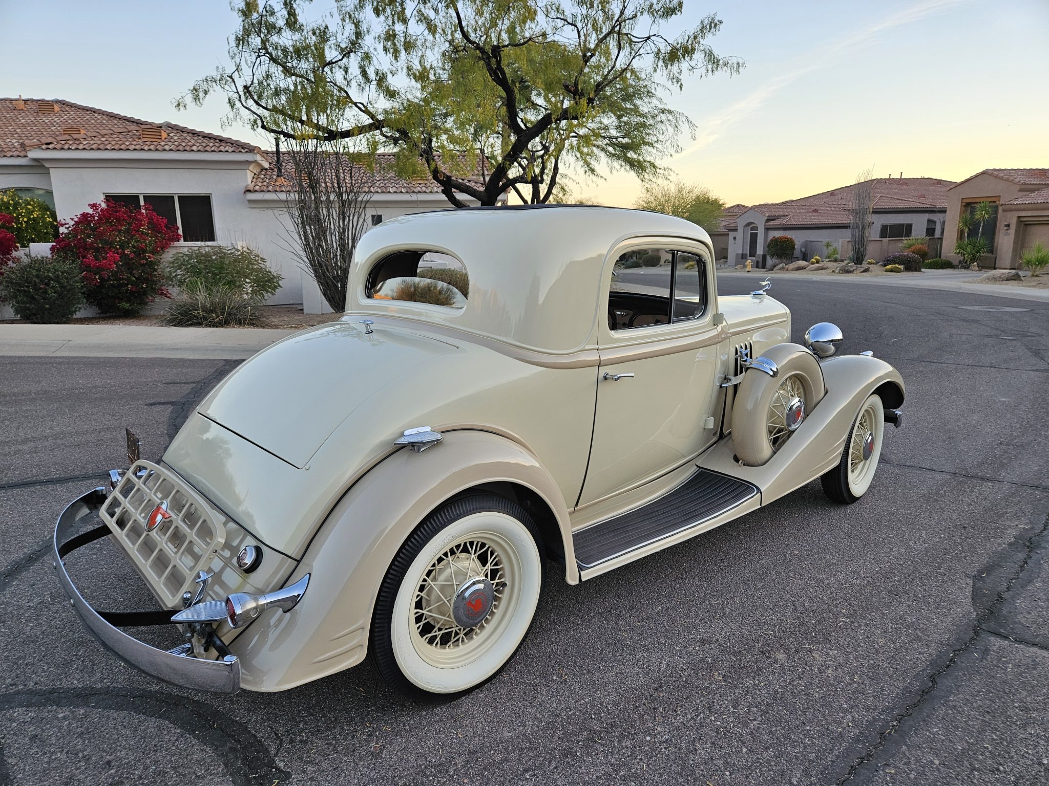 Body-color wire-spoke wheels feature chrome Pontiac-branded hubcaps, and they are mounted with 5.25–5.50–17″ Firestone whitewall bias-ply tires. Matching spare wheels are stowed in body-color hard covers in the fenders. The Economy Eight rode on a 115″ wheelbase and featured front and rear leaf springs. Braking is handled by drums at all four corners.