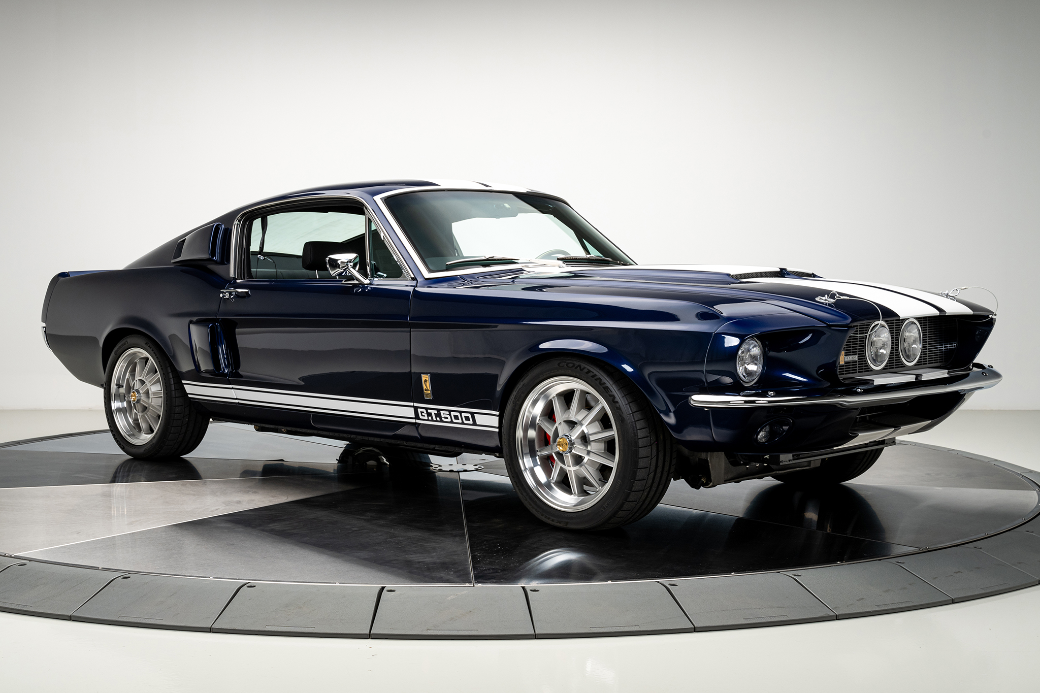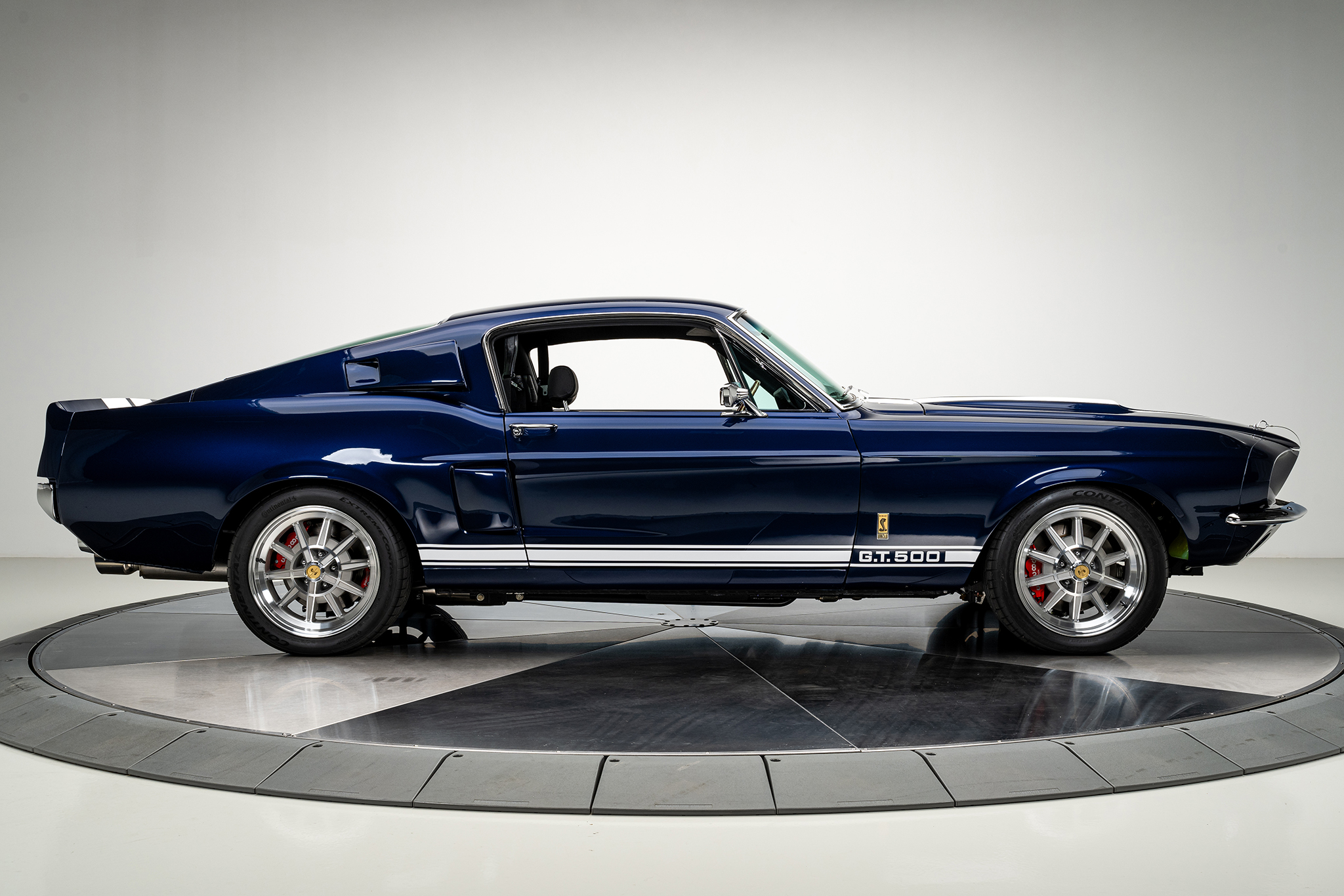This Shelby GT500 example is listed as production #127 in the Revology registry and is painted Midnight Blue Metallic with Wimbledon White over-the-top stripes. Vinyl stripe decals were applied to the sides, and the fiberglass hood is supported by billet aluminum hinges with gas struts. Exterior details include an integrated rear spoiler, center-mounted driving lamps, LED lighting, exposed hood locks, side scoops, and chrome bumpers and mirrors.