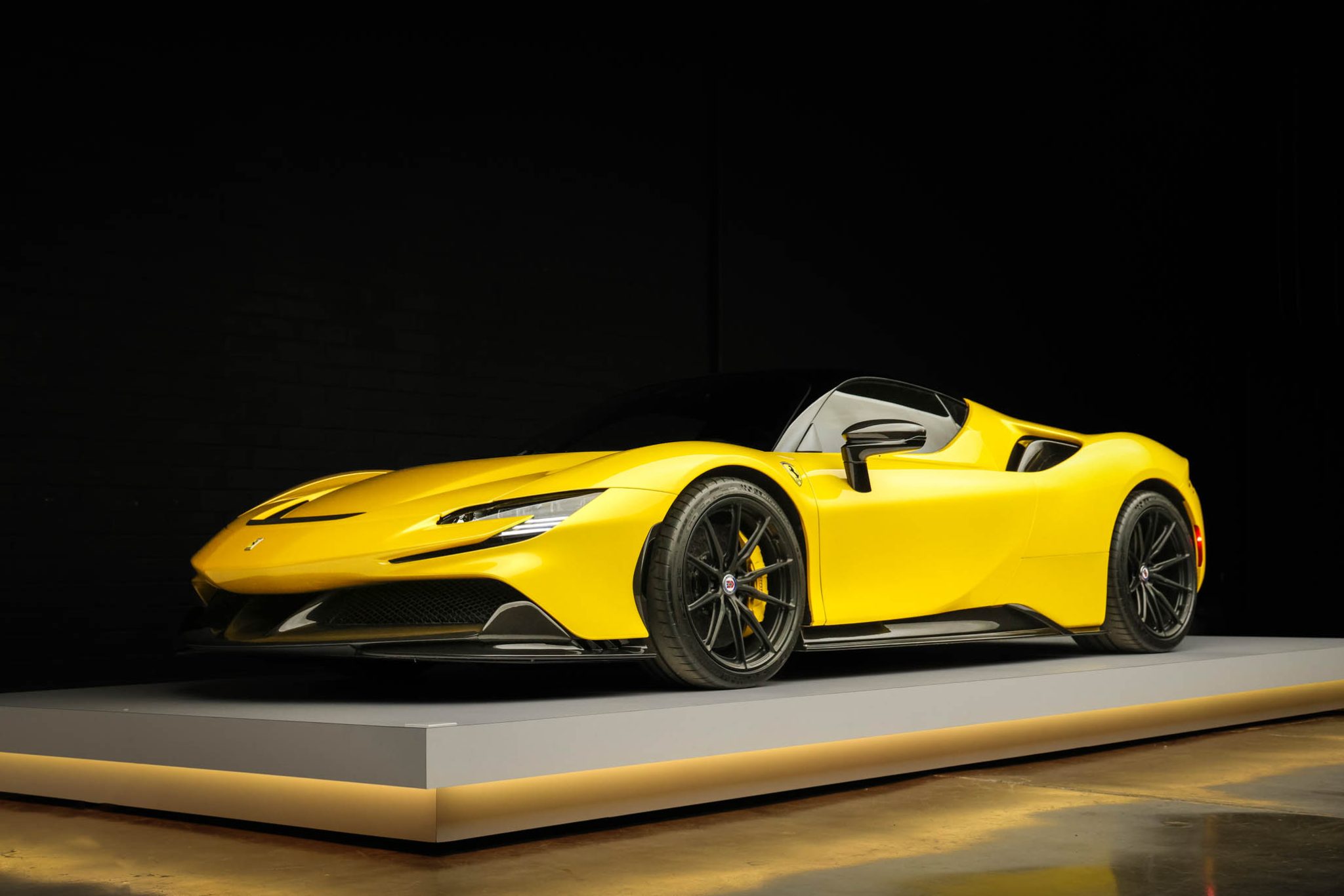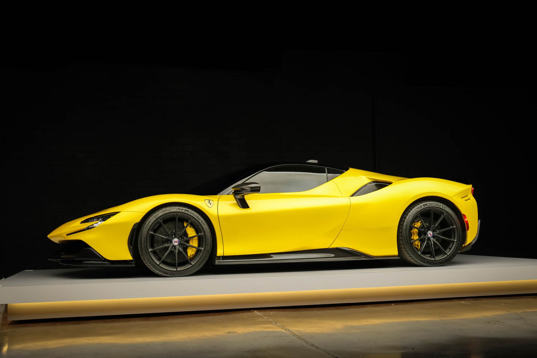 Black-finished 20″ HRE wheels are mounted with 255/35 front and 315/30 rear Michelin Pilot Sport Cup 2 tires. The SF90 Stradale features an aluminum chassis, and Multimatic-sourced shocks and titanium springs were included as part of the Assetto Fiorano package. The electronic Side Slip Control (eSSC) system can distribute torque to all four wheels, while the electric traction control system (eTC) can deliver power to individual corners. The regenerative braking system is controlled via a brake-by-wire system that splits braking between the hydraulic system and the electric motors. A yellow-finished caliper and a carbon-ceramic rotor are fitted at each corner.