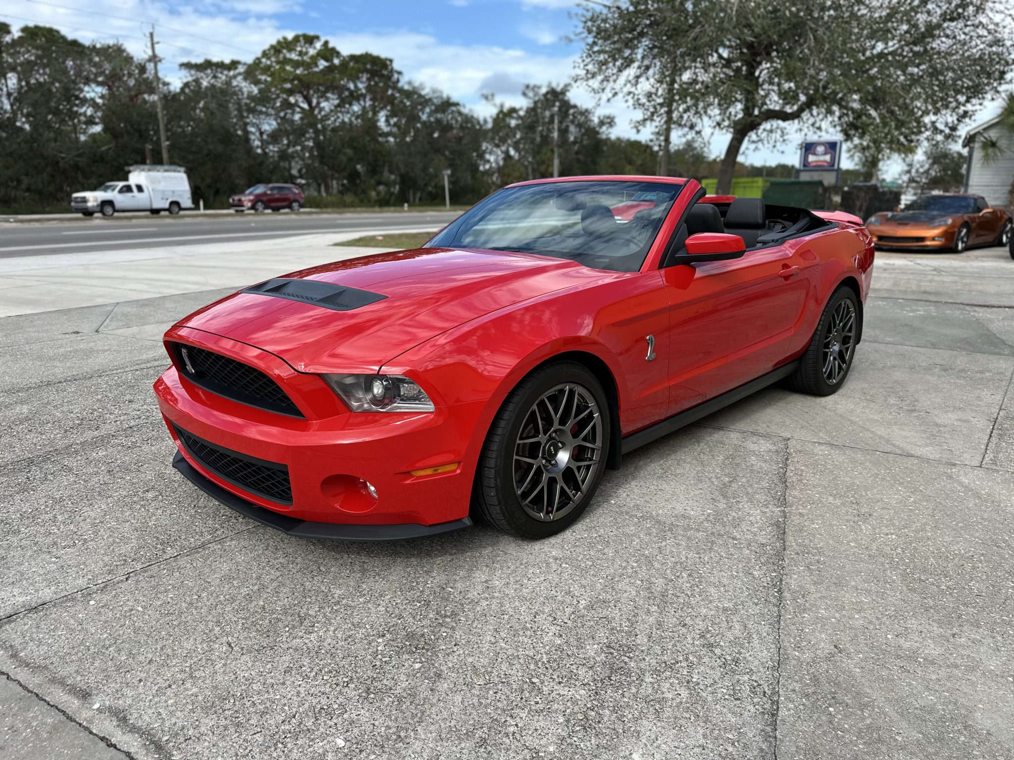 Staggered-diameter 19″ and 20″ forged alloy wheels are mounted with Goodyear Eagle F1 Supercar front and Michelin Pilot Sport A/S 3+ tires out back. Stopping power is provided by four-wheel disc brakes with Brembo front calipers, and the car is equipped with an SVT-tuned suspension.