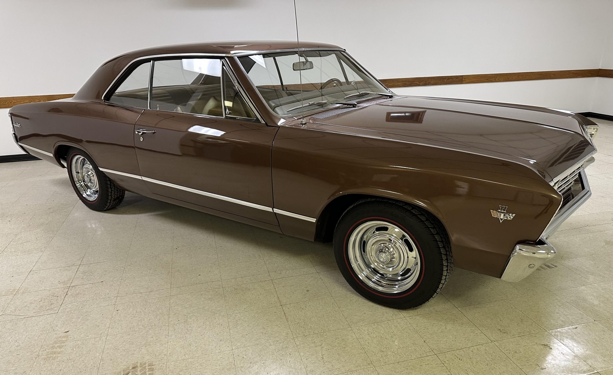 Chrome-finished Rally 15″ wheels are mounted with 215/65 BFGoodrich Silvertown Radial red-line tires that were installed in 2019. The car is equipped with power steering as well as a front and rear coil-spring suspension, and braking is provided by front and rear drums.