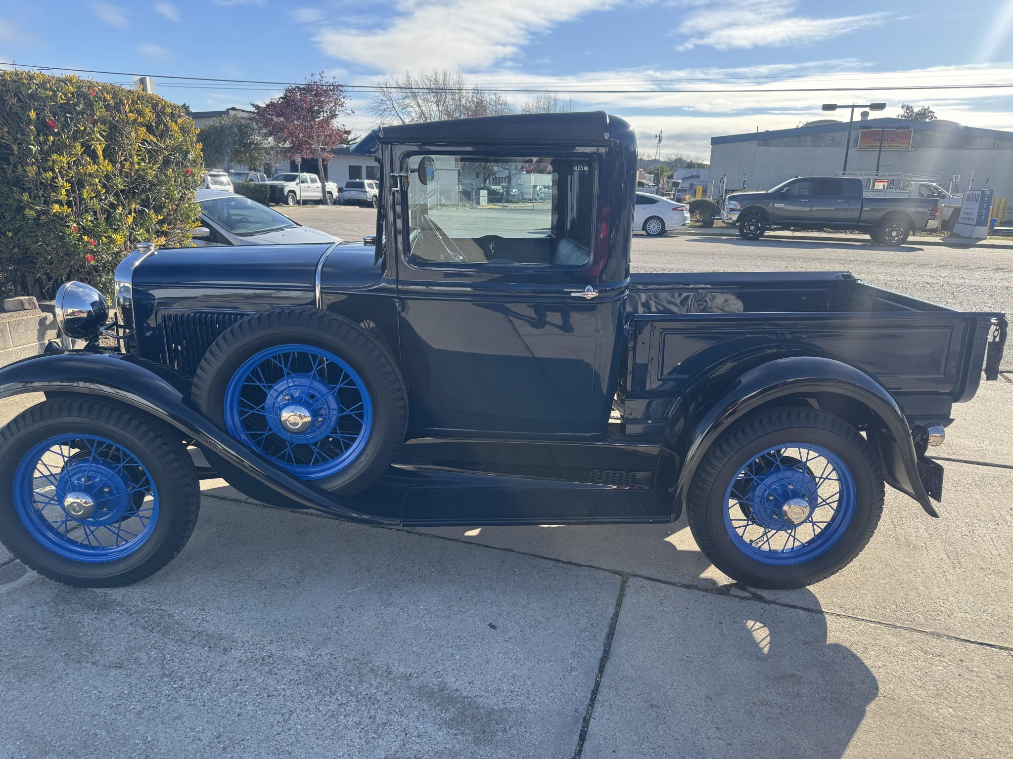 Lighter blue 19″ wire wheels are mounted with Firestone tires, as is a matching spare located in the left-front fender. Braking is provided by four-wheel drums.