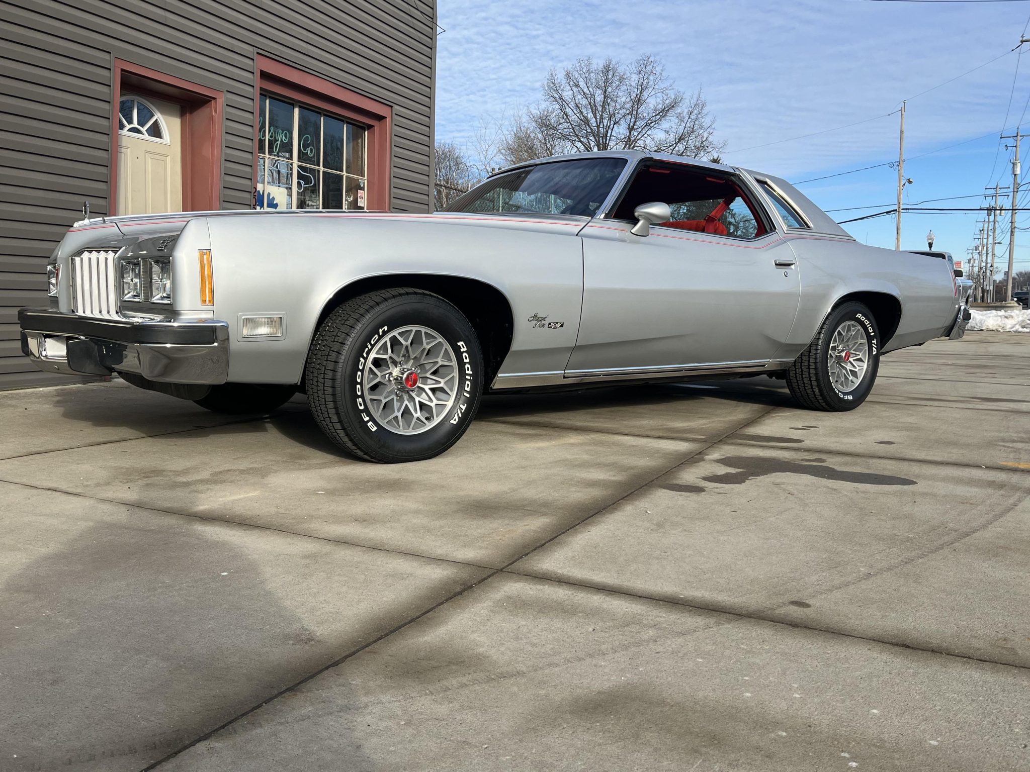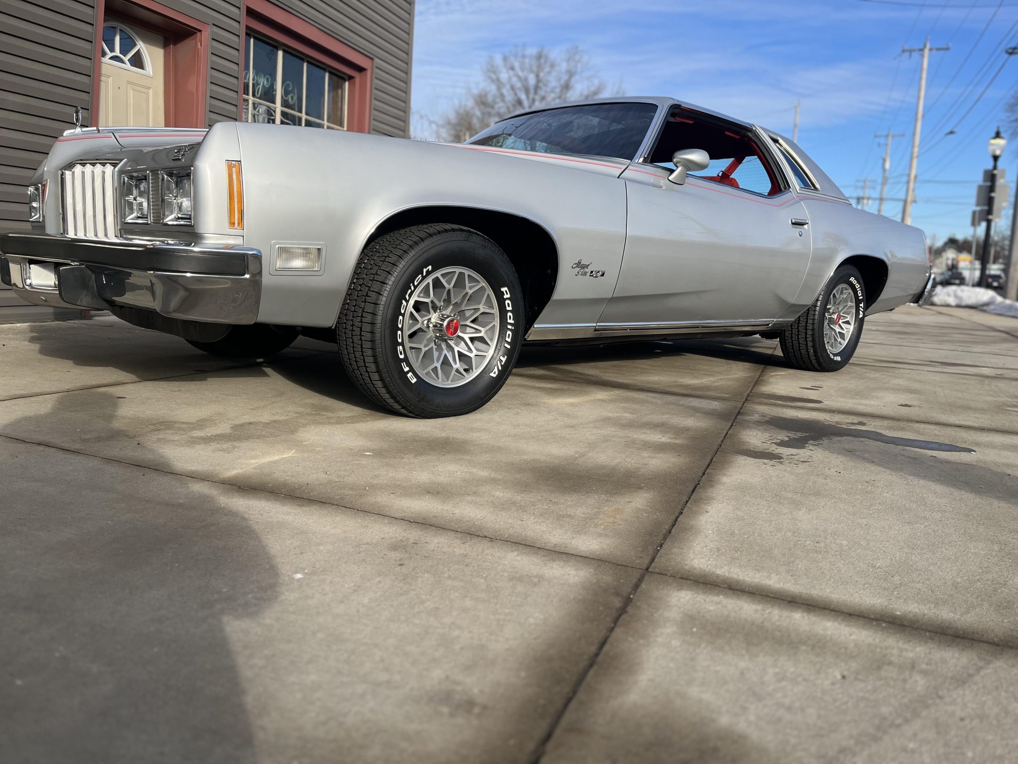Snowflake-style 15″ wheels are wrapped in 255/60 BFGoodrich Radial T/A white-letter tires produced in 2024. The car is equipped with the Rally Radial Tuned Suspension package, and braking is handled by power-assisted front discs and rear drums.