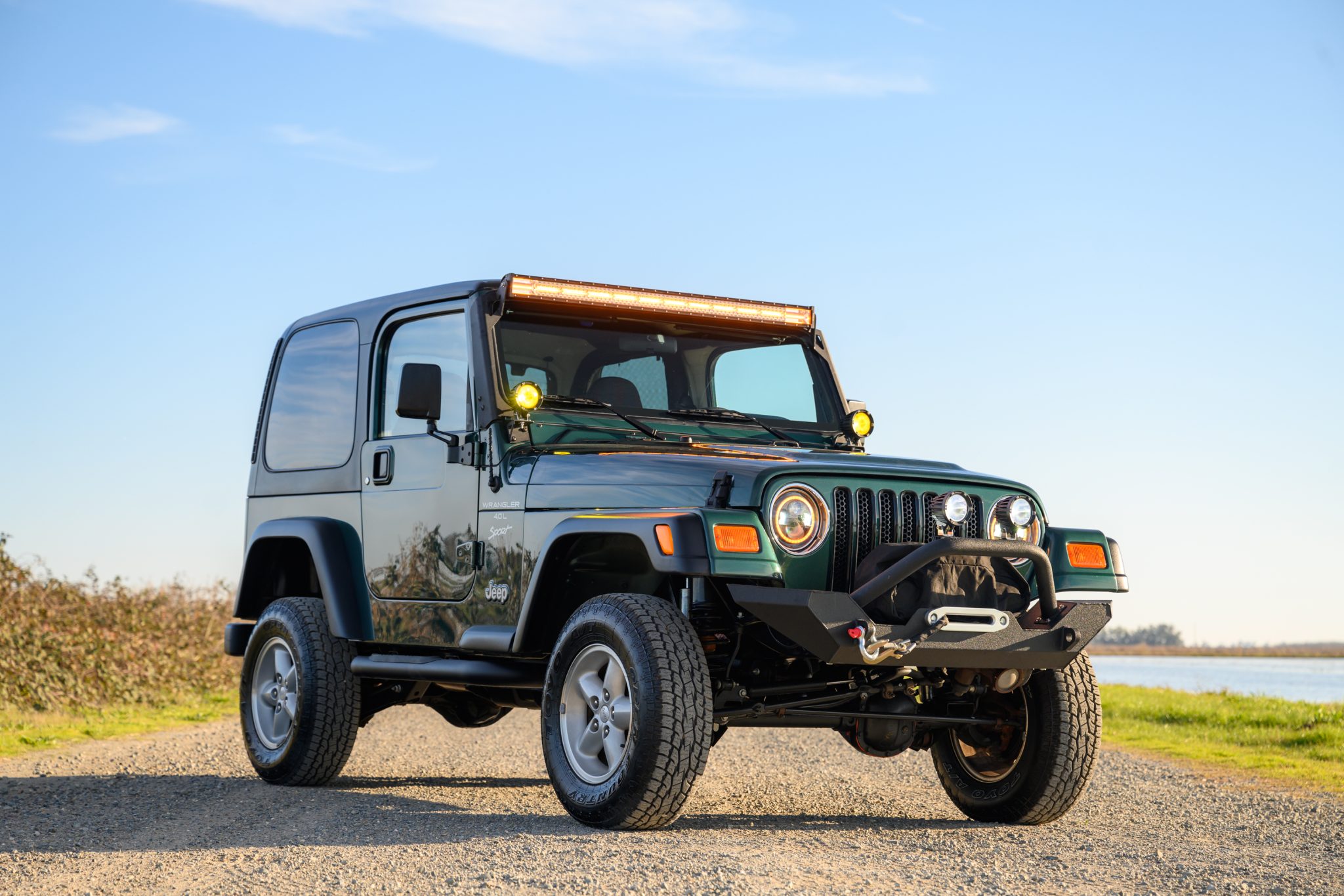 The 15″ Grizzly cast-aluminum wheels are mounted with 225/75 Toyo Open Country A/T II tires that were manufactured in 2018, and a full-size spare is affixed to a swing-out rear carrier. The Jeep came factory equipped with power steering and a Quadra-Coil multi-link suspension with live solid axles, and a 4″ suspension lift has been fitted. Braking is handled by front discs and rear drums with ABS.