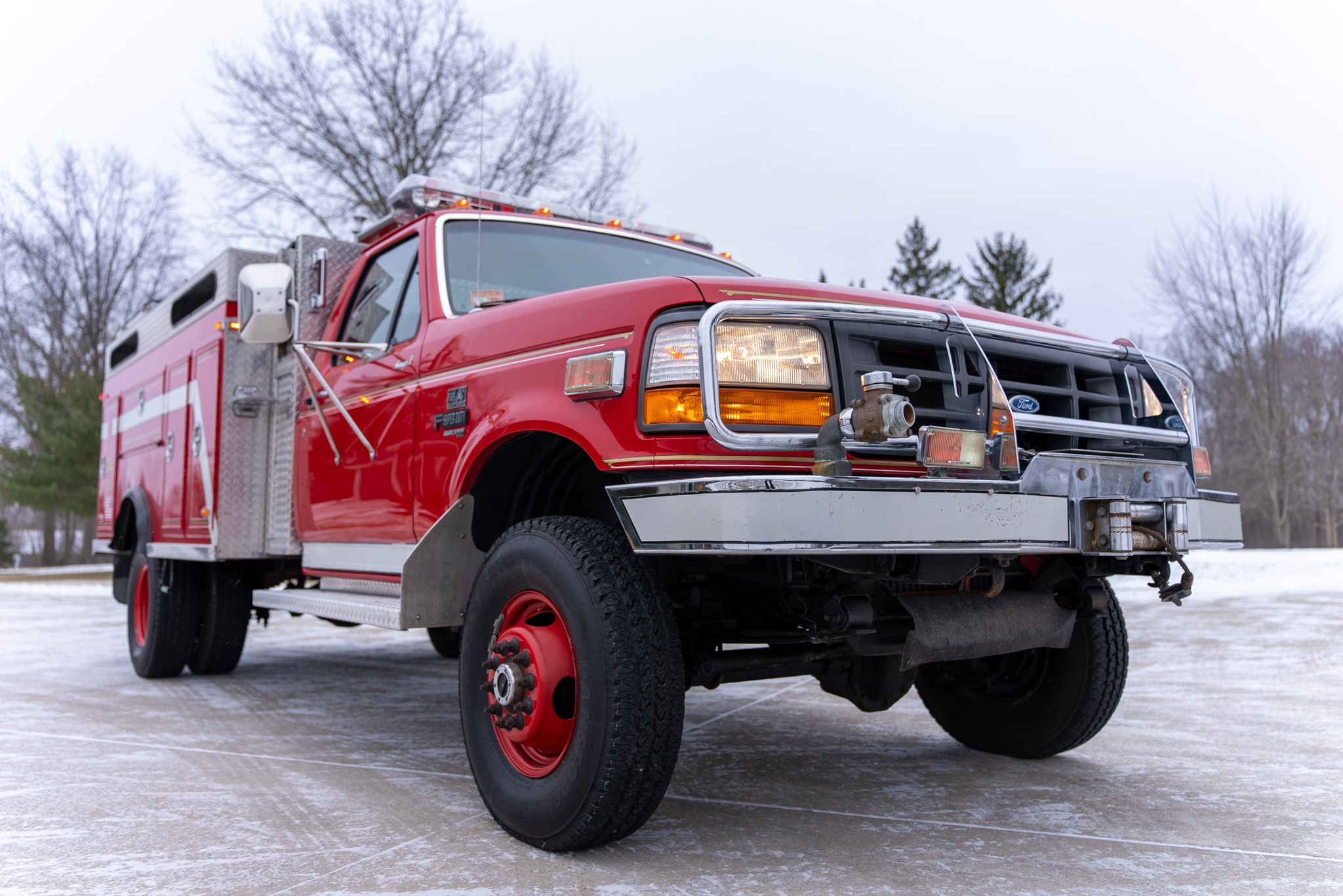 The First Out fire apparatus is equipped with a Darley gas-powered skid pump paired with a 300-gallon Poly-Tank from United Plastic Fabricating (UPF). A Hannay hose reel with an electric motor is affixed up top, and the unit is further outfitted with a Kussmaul auto-charge electrical setup, an LED spotlight, and lockable side storage boxes. Diamond-plate panels and an extended rear bumper with a step platform are additional details.