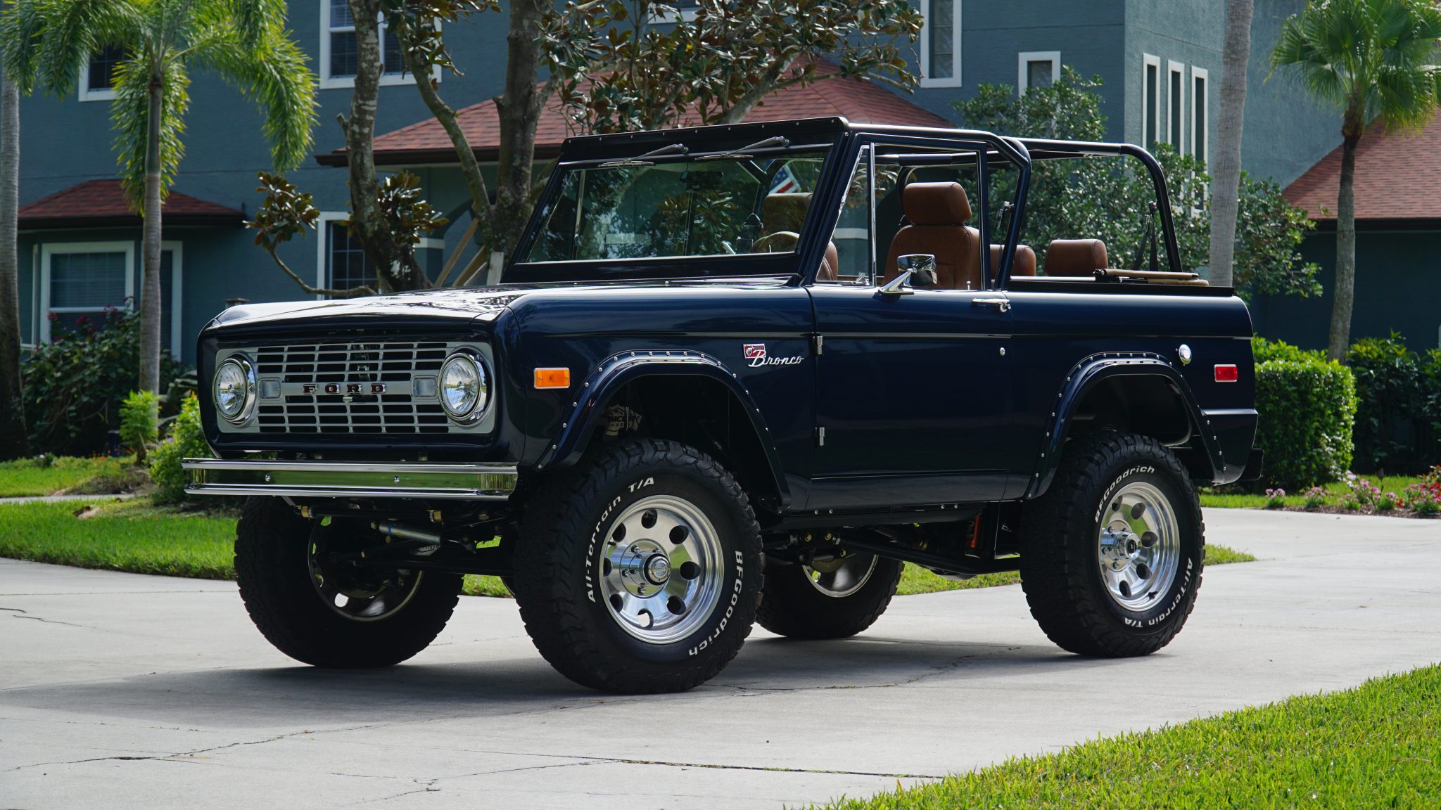 Polished 17″ eight-hole alloy wheels are mounted with 285/70 BFGoodrich All-Terrain T/A KO2 white-letter tires. The front axle is equipped with Mile Marker manually locking hubs, and Borgeson power steering components are installed in addition to a Bilstein steering stabilizer. The truck rides on a lifted suspension with coil springs, TracTive remote-reservoir shocks, and four-link geometry front and rear. Stopping power is provided by a hydroboosted Wilwood master cylinder and four-wheel disc brakes.