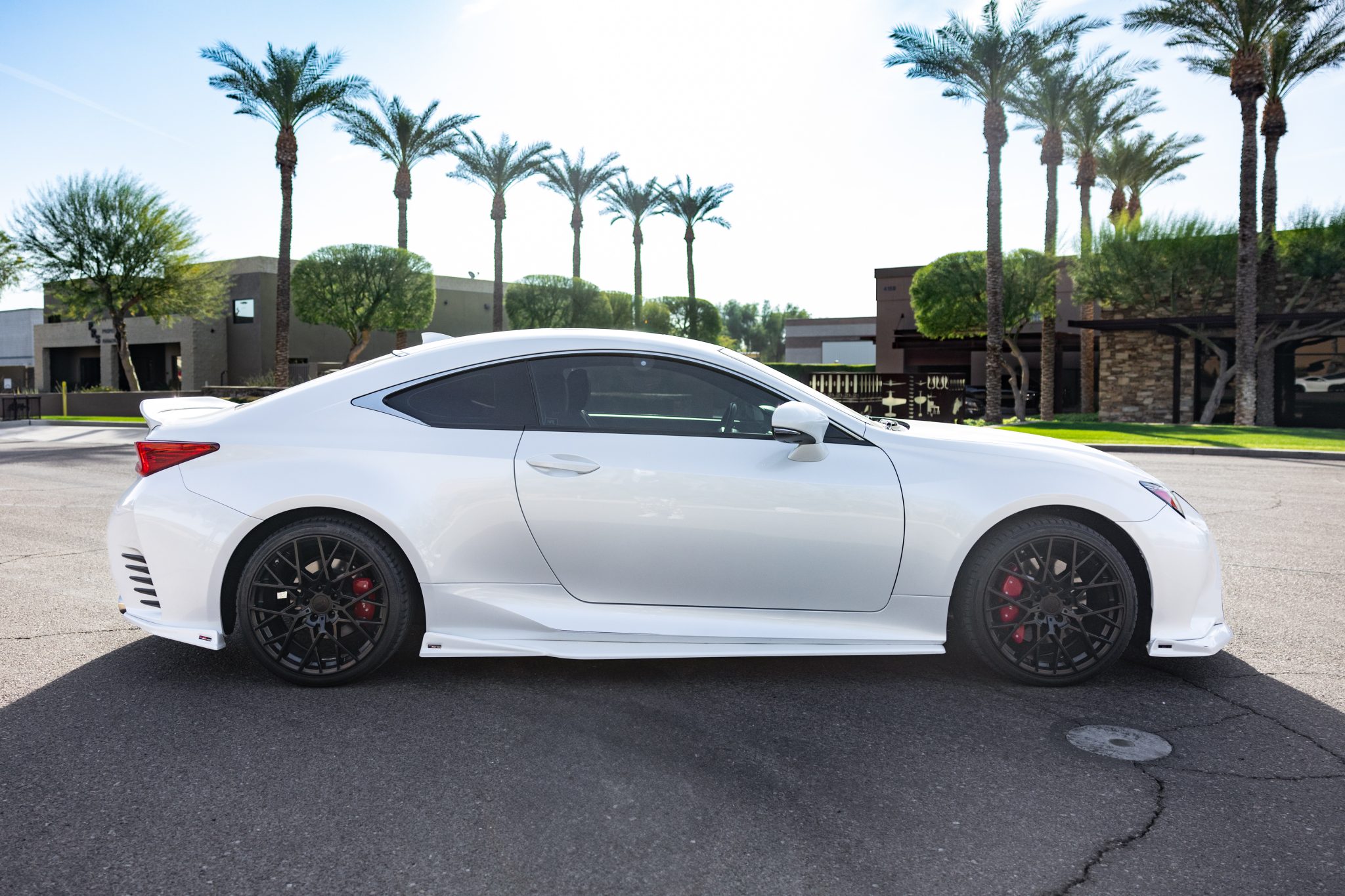 The car is finished in Eminent White Pearl and has been modified with an NIA rear spoiler and lower bodywork along with an RC350-style grille and a rear diffuser. Additional details include a rearview camera, quad exhaust outlets, LED headlights, tinted windows, and a sunroof.
