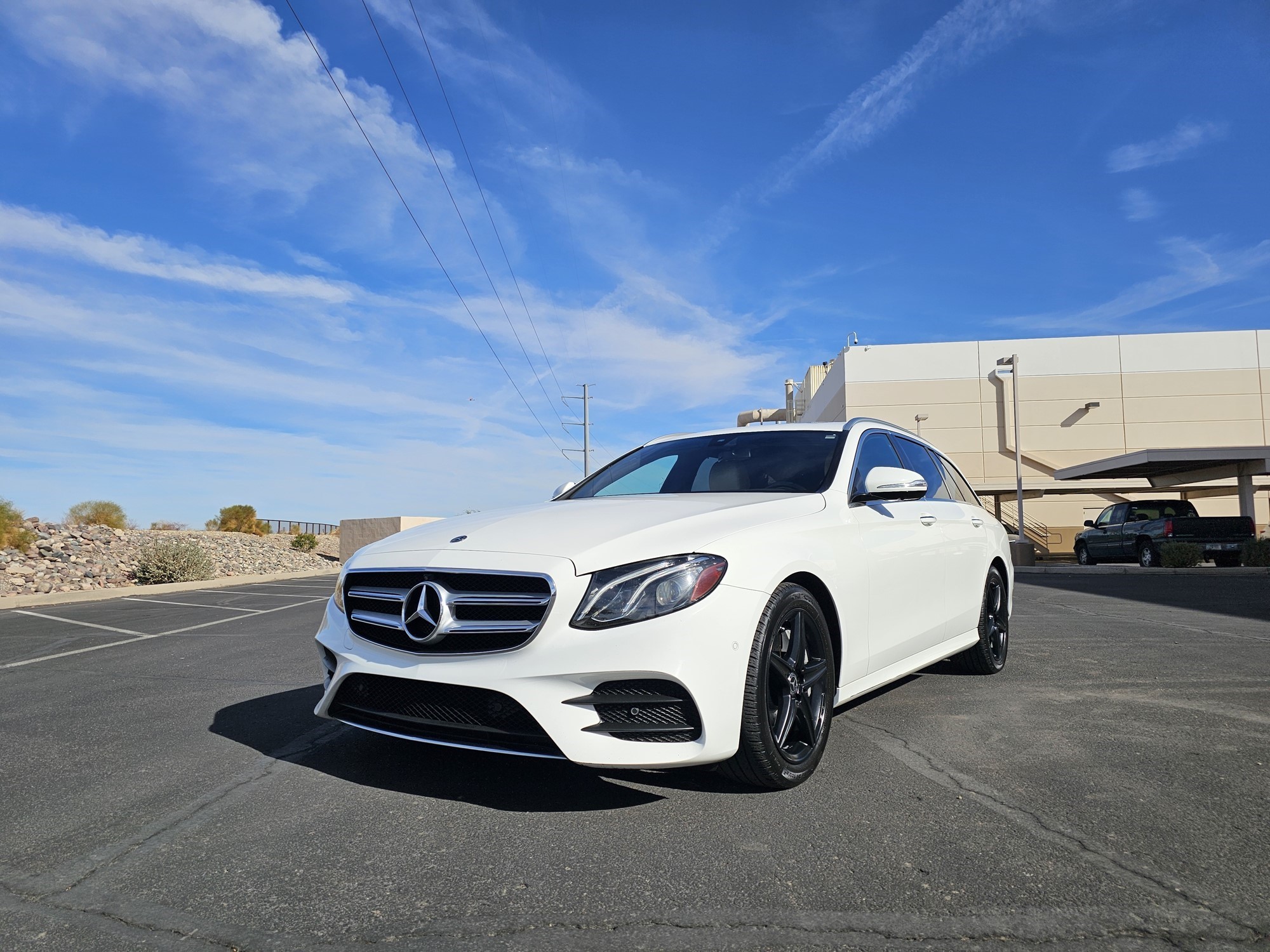 Black-finished 18ⳠAMG five-spoke wheels are mounted with Hankook Ventus S1 Noble2 tires. The car features a self-leveling air suspension system at the rear, and braking is provided by four-wheel discs with Mercedes-branded calipers over cross-drilled rotors up front.