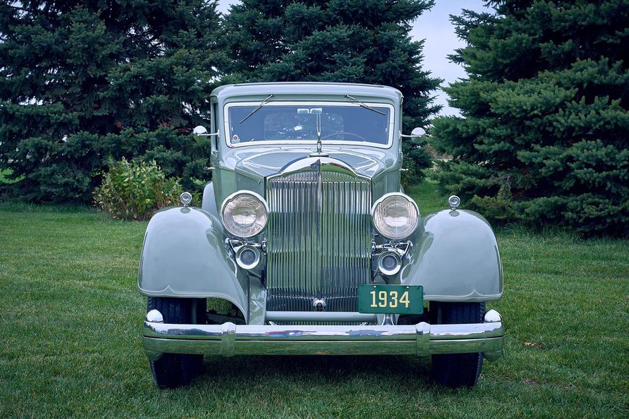 This 1934 Packard 1107 five passenger coupe with the V-12 engine has the clean long hood lines that comes with the rear mounted spare