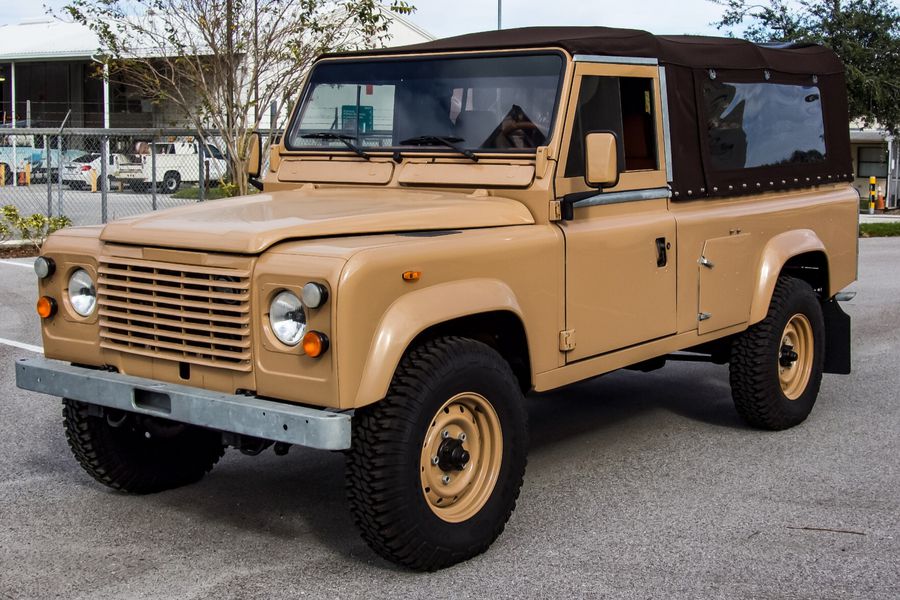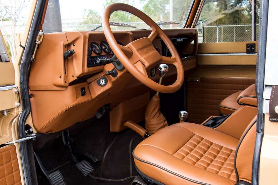 Up for sale is this fully restored 1987 Land Rover Defender 110 Soft-Top finished in Tan over a custom leather interior