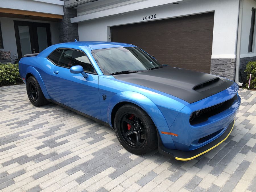 Car comes with numbers matching race crate from Snap On. The B5 Blue is stunning & in my opinion the best color Demon out there! This Demon has all the important options available. Passenger & Rear seats. Red seat belts. Harman Kardon 18 speaker 900 watt stereo Satin Black hood B5 Blue (was one of 4 special color options)