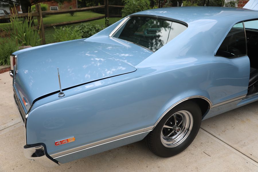 1966 Oldsmobile 442 Holiday Coupe Location: Milford, Ohio 45150VIN #: 338176M240114 Block #: 390925E, 1966 Julian Date 3-digit number: 334 in which the block was cast Mileage: 250 after restorationTransmission: ManualCondition: ExcellentExterior: Lucerne MistInterior: BlackThe ''4-4-2'' name (''Four-four-two'') comes from the original car's FOUR-barrel carburetor, FOUR speed manual transmission, and dual exhausts