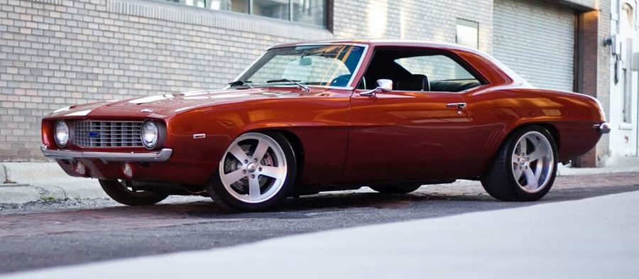 1969 Pro-Touring Camaro Trixster orange metallic paint by Keith Strong (formerly Ice Nine Customs) DSE Speed 1 front suspension installed by B and B Classics DSE Quadralink rear suspension installed by B and B Classics DSE mini tub and sub frame connectors installed by B and B Classics Hydratech Hyroboost brake system Baer Track brakes – rotors drilled and slotted Boze Flyte forged wheels – 18x12