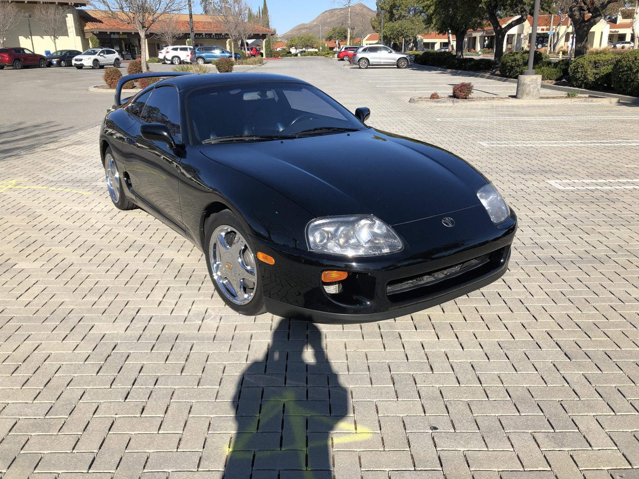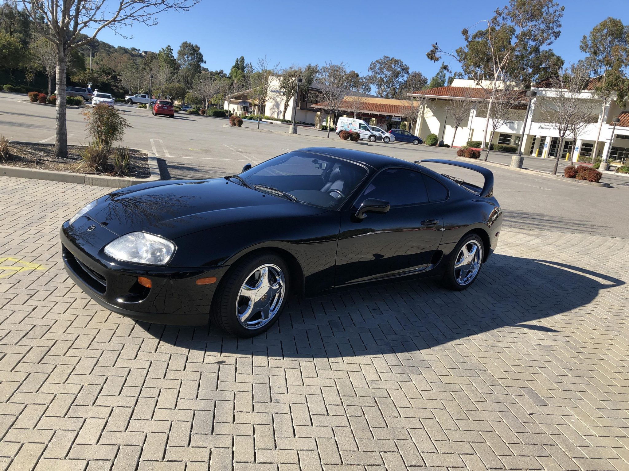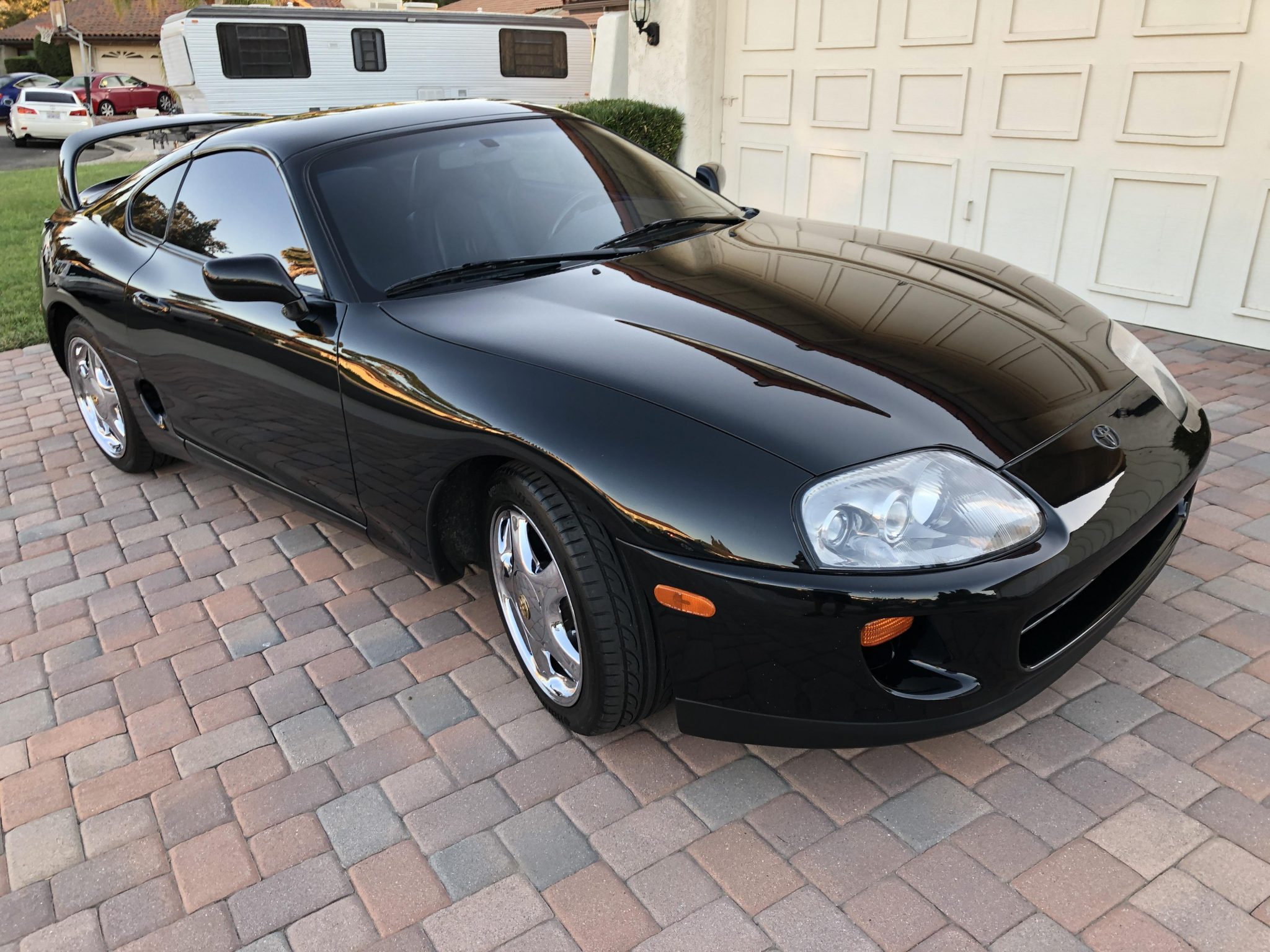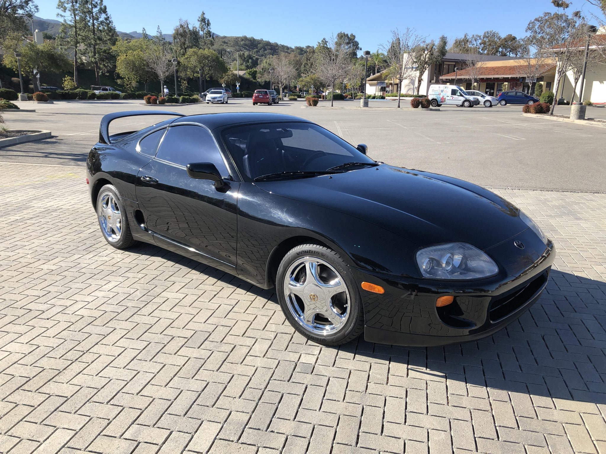 The factory 17″ wheels were chrome-plated by the seller and are fitted with staggered Hankook Ventus V12 Evo2 tires measuring 235/45 up front and 255/40 out back. The car is equipped with disc brakes and Supra-branded brake calipers at each corner. The brake fluid was reportedly flushed in June 2019, curb rash is noted on the wheels, and a compact spare is mounted in the trunk.