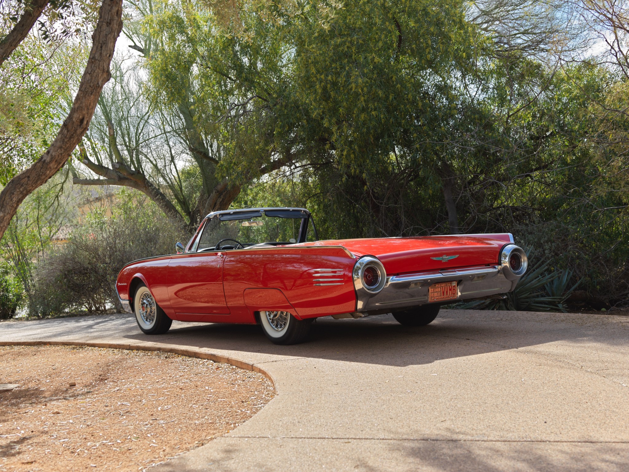 The replacement tan convertible top is shown raised in the gallery. Kelsey-Hayes wire wheels wear 14″ wide-whitewall tires. The car features power-assisted steering and brakes, and new suspension components are said to have been installed.